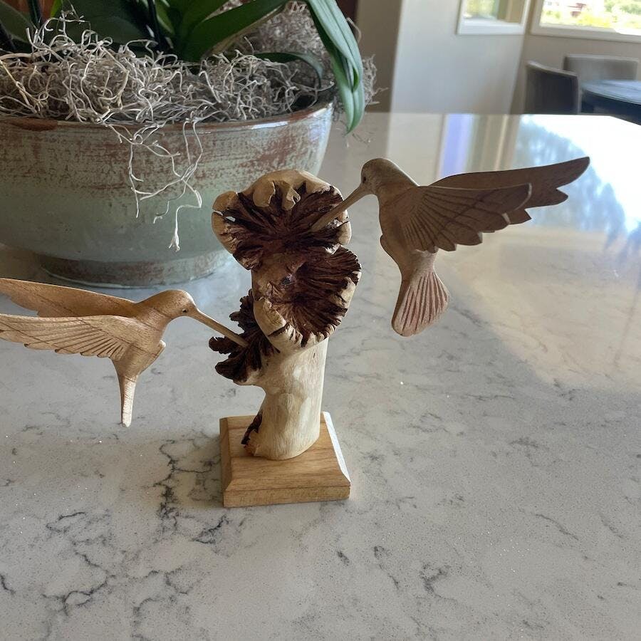 Two beautiful birds, look like hummingbirds, beautiful sculpture in wood. A present for my son, who absolutely loved it. Many many thanks to Yudi.