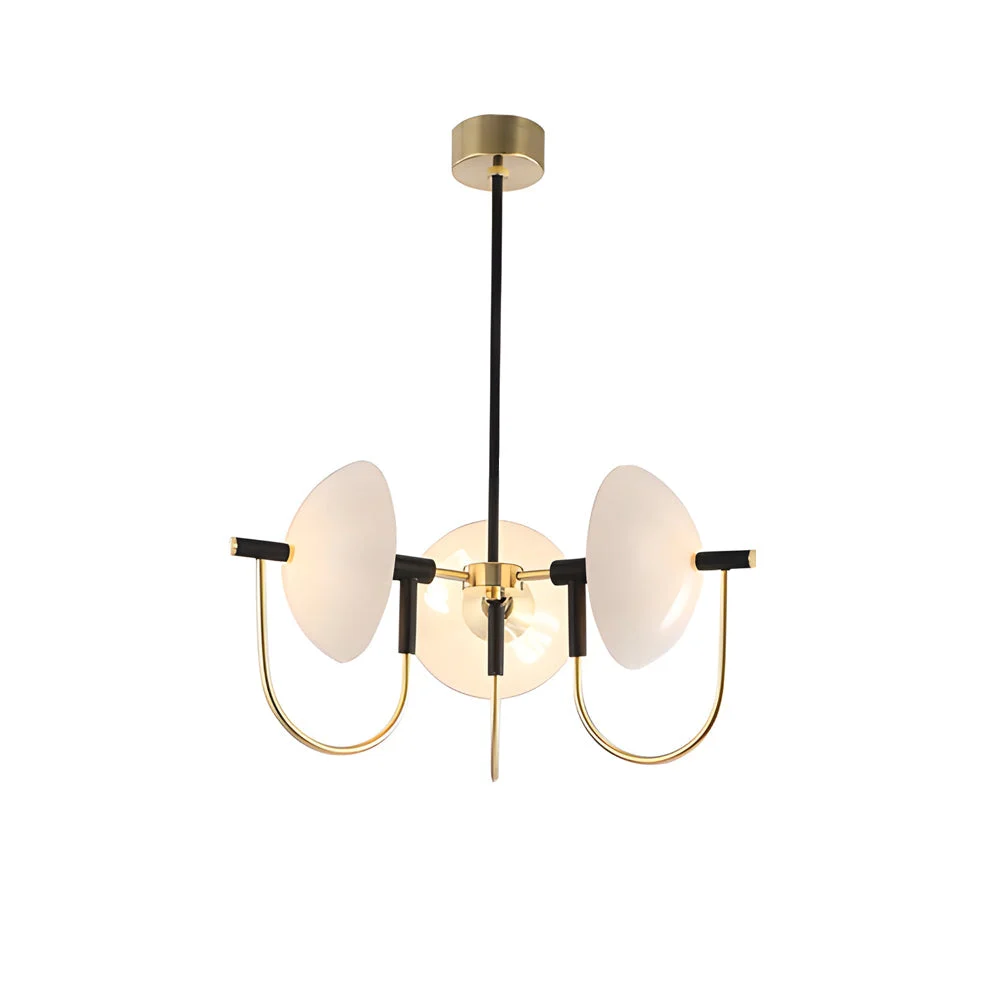 - This Aperture chandelier features a sleek black and gold hardware frame, accentuating its geometric form and sophisticated appeal. With 1, 3, or 6 frosted white opal glass hemisphere shades float suspended by black metal rods accented with U-shaped golden arms accents providing soft glowing light creating an environment that is comfortable and flattering.