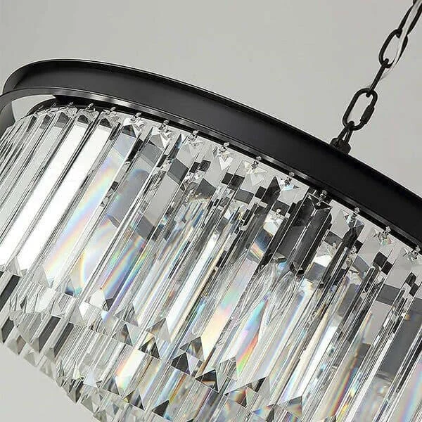 Finished black with a circle of crystal drops each side of the lamps. This classic chandelier would suit a lounge or hanging over a dining table. Also available in a smaller and larger size.