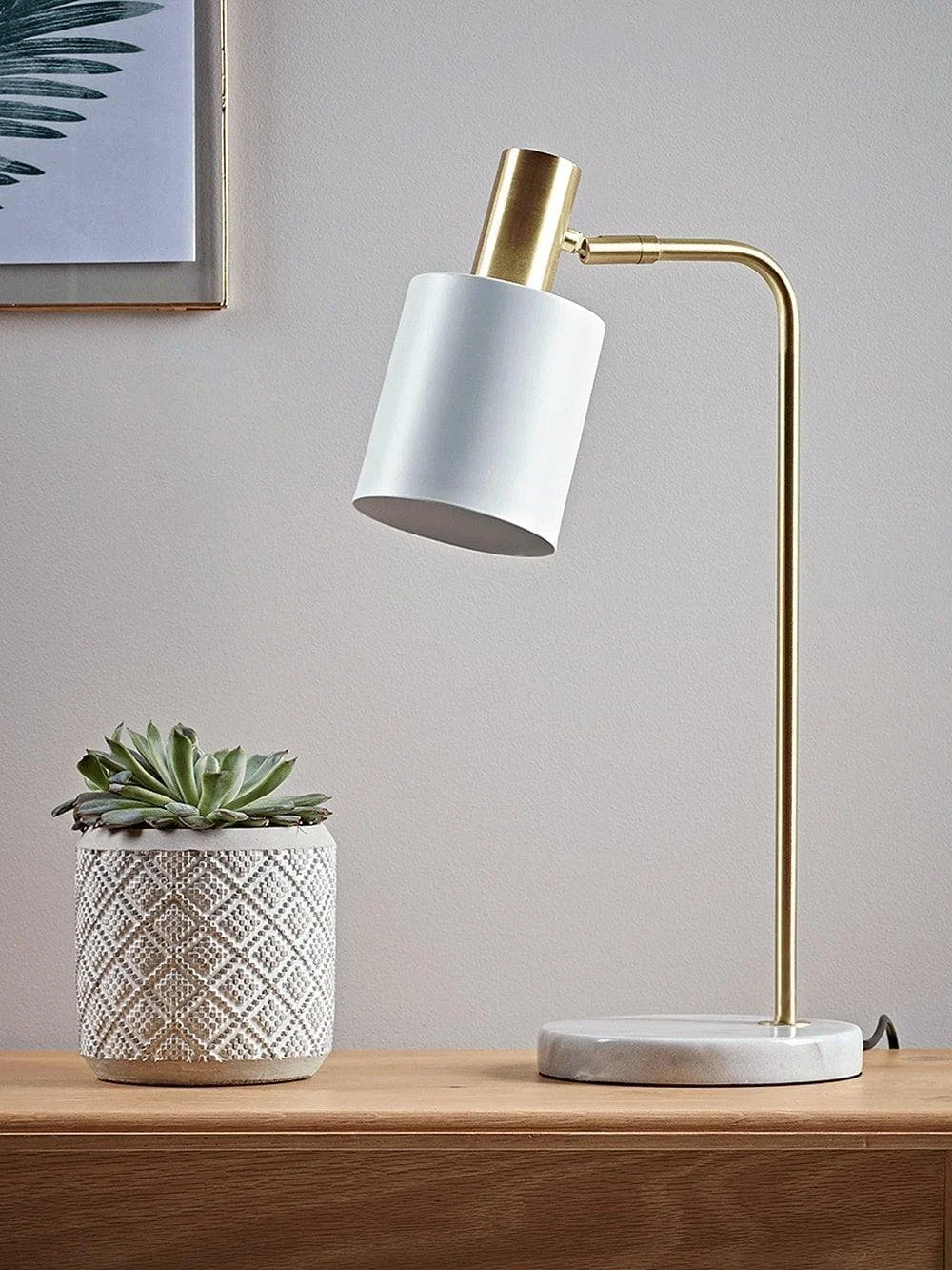 Featuring a Matt Jade or Matt White metal shade and White Marble Base. Round metal shade is mounted on the body via an adjustable knuckle, So that the user can adjust the lamp shade appropriately.