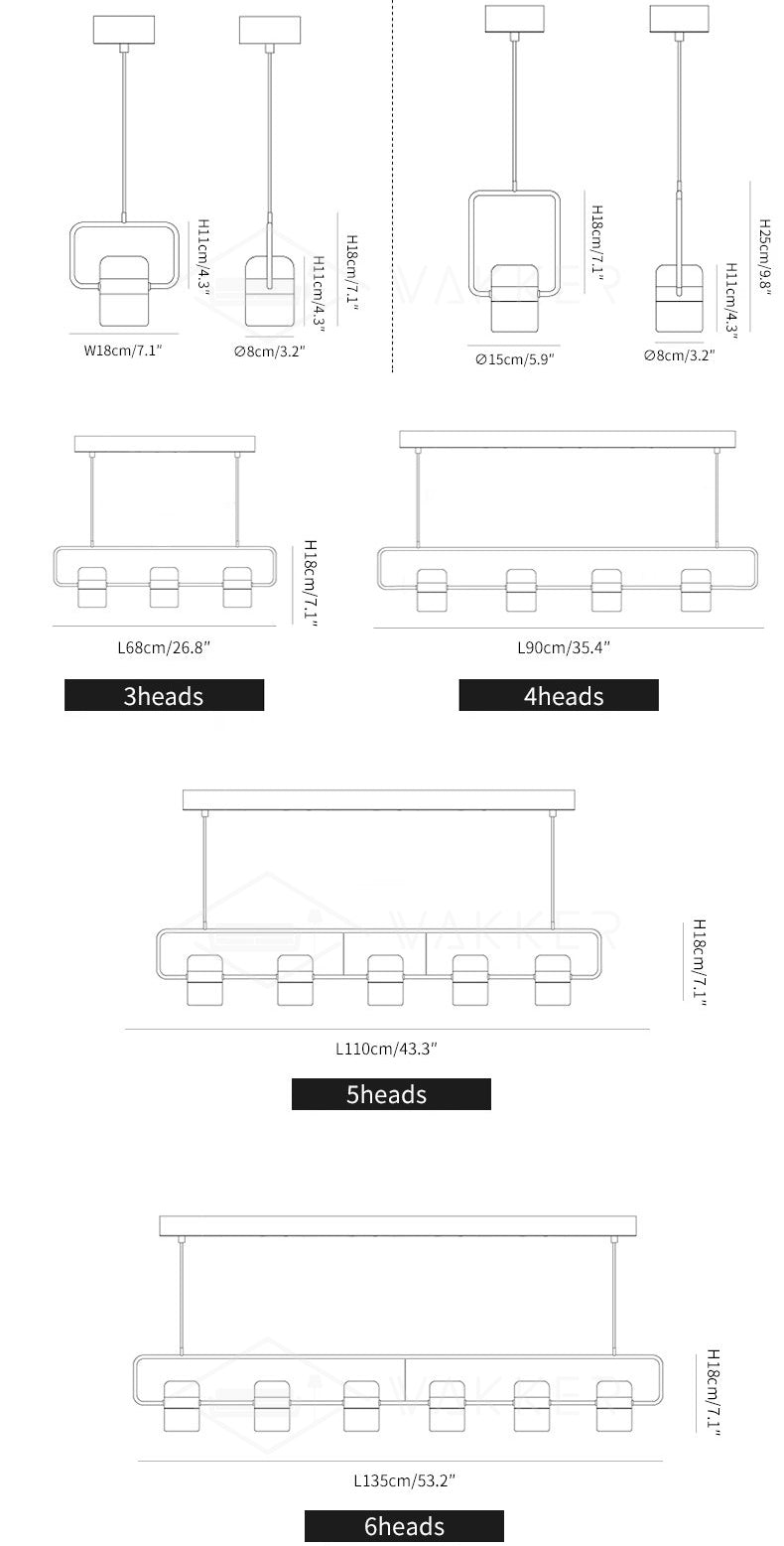 Pendant 6heads size: L 135cm x H 18cm / L 53.2″ x H 7.1″