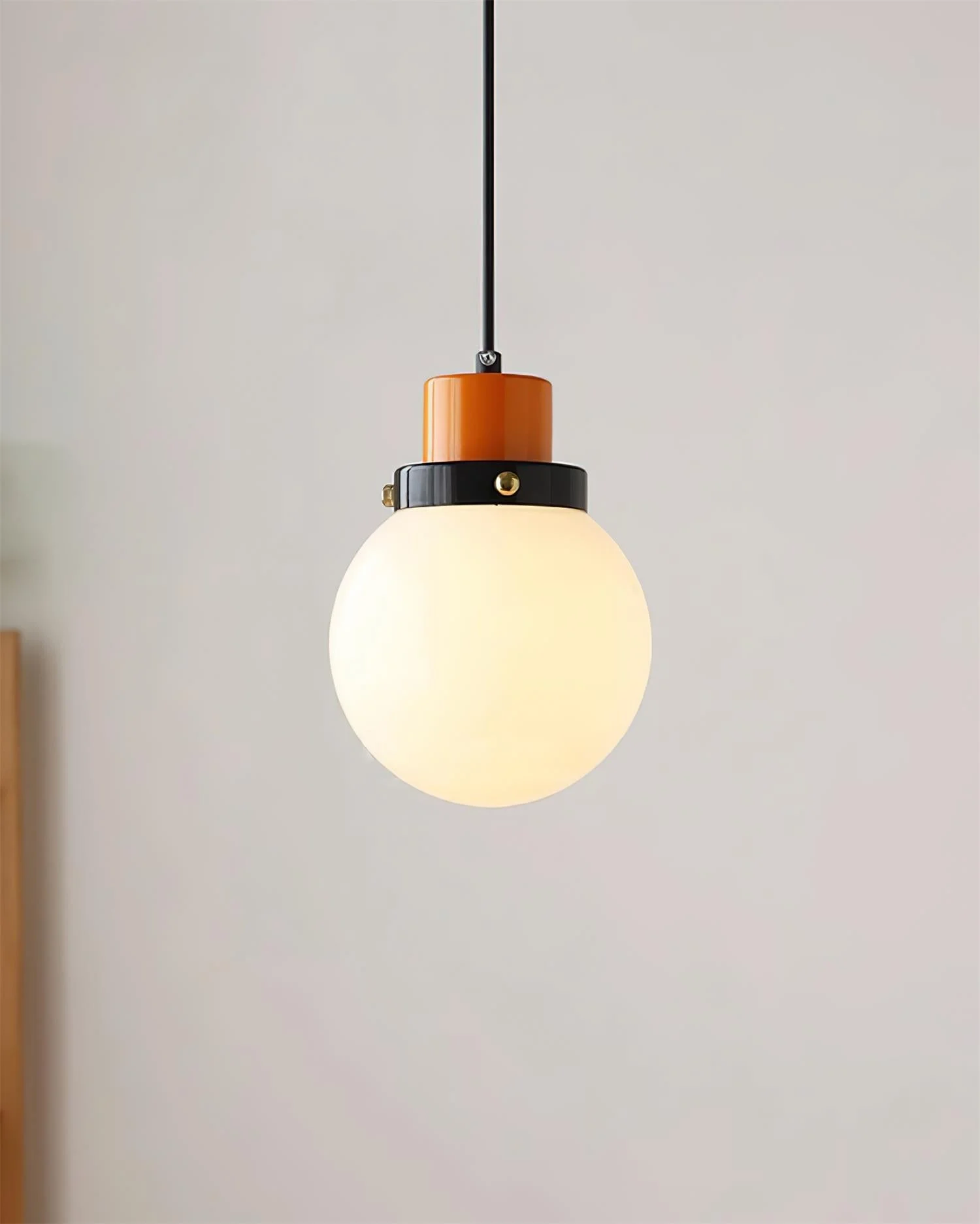 Infuse your space with bold style using this retro-inspired pendant lamp. Featuring a frosted glass globe that casts a soft, warm light, it creates a welcoming ambiance perfect for kitchens, dining areas, or living rooms. The unique design combines orange and black accents on the base, making it a true statement piece. Suspended from a sleek black cord, this lamp seamlessly blends vintage charm with modern flair.