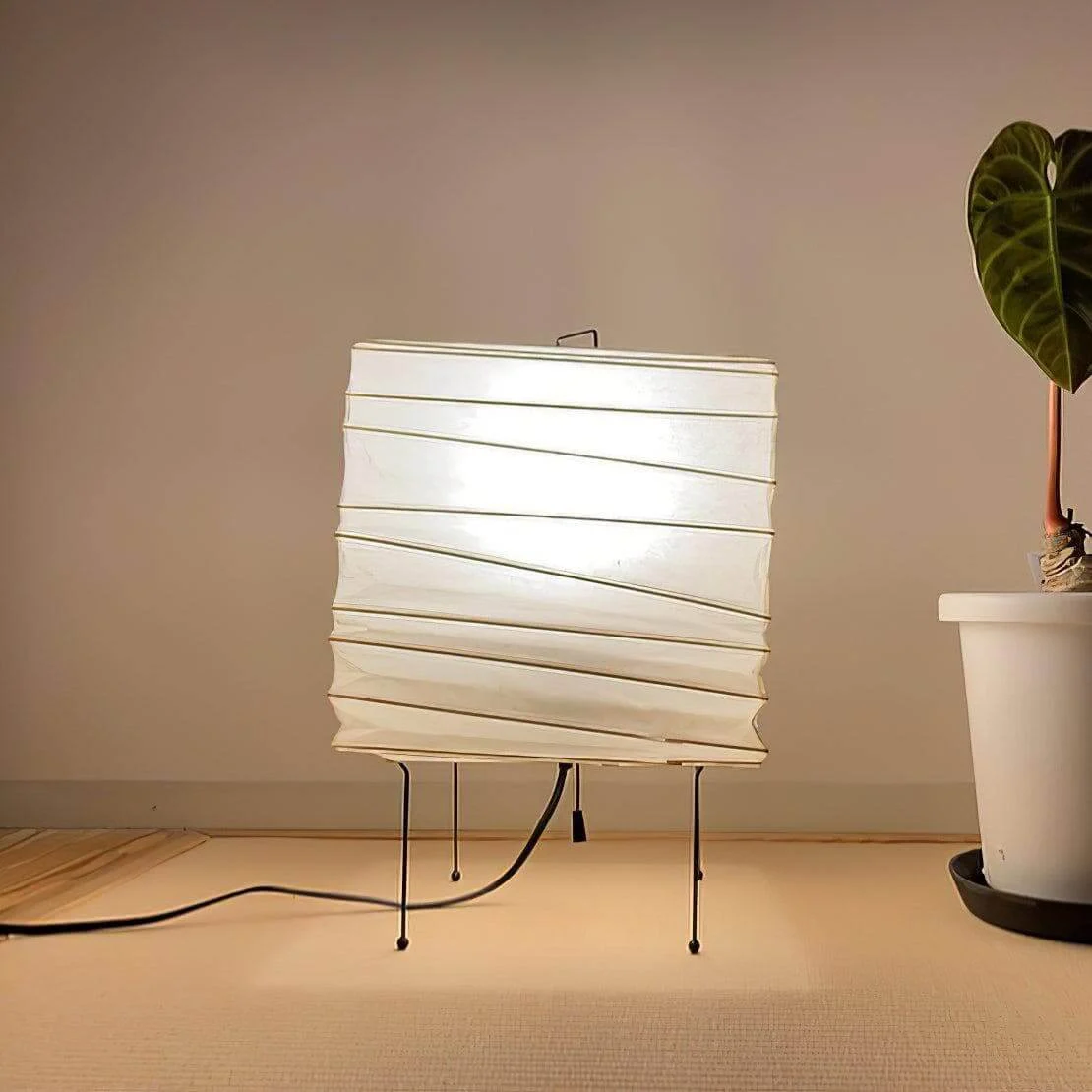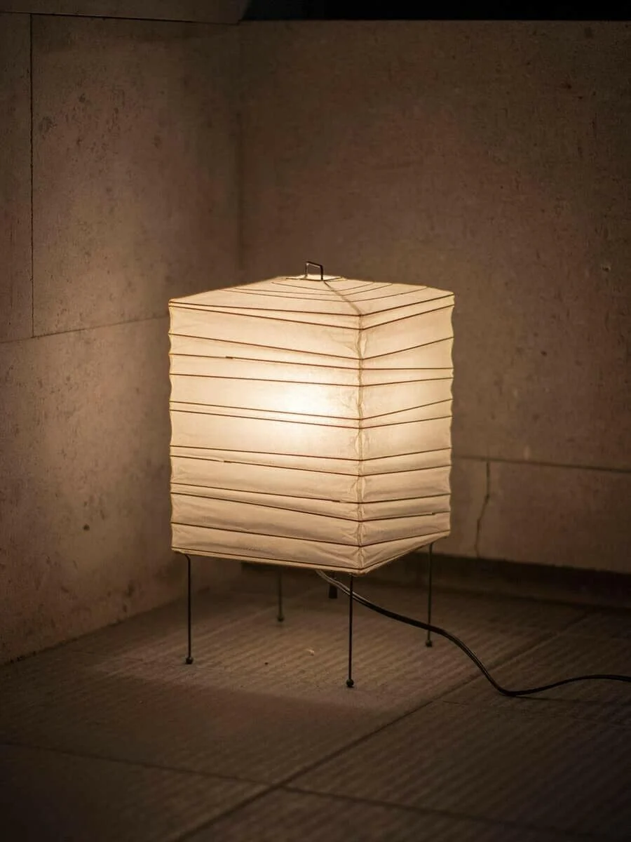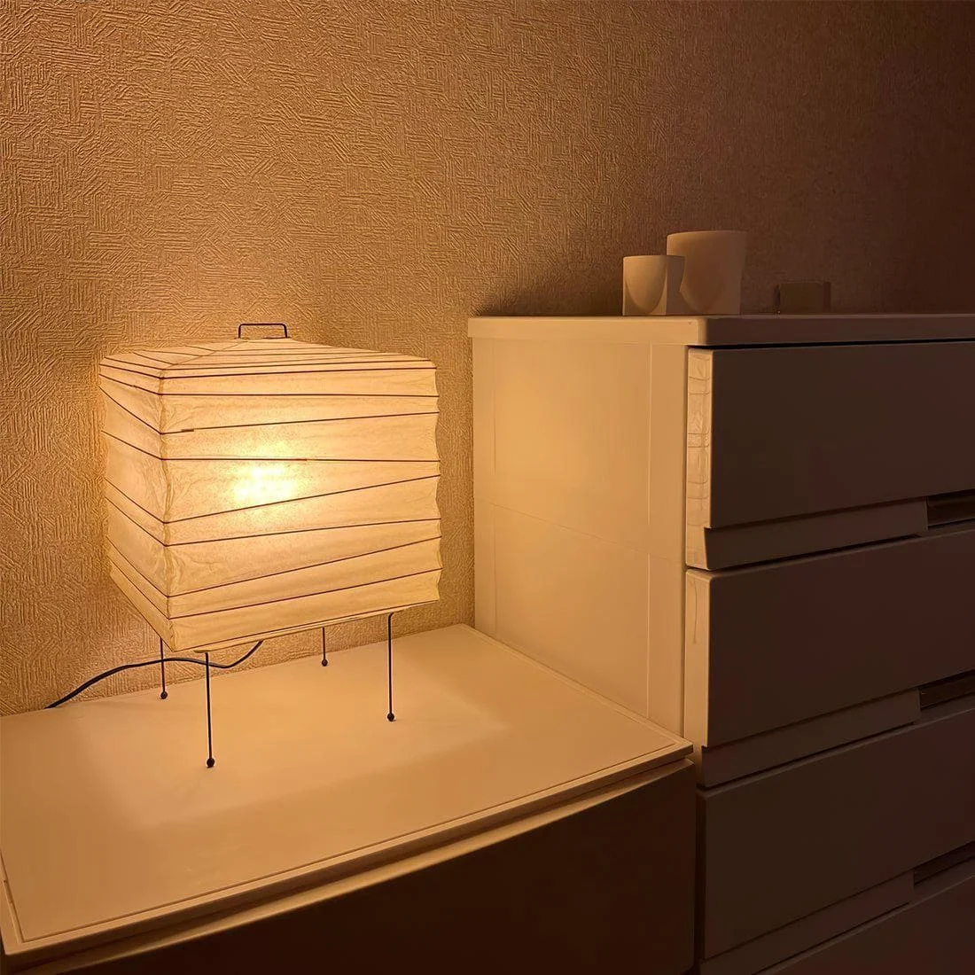 Embrace a touch of minimalist chic with this Akari 3X Table Lamp where functionality meets sculptural design. This lamp’s cubic form is a modern take on classic paper lanterns, with each crease and fold in the shade adding depth and character to its illumination. Its delicate yet sturdy black wire legs give it a lightweight appearance, as if the cube of light is floating above the surface. A small, practical handle crowns the lamp, hinting at both its portability and functional design.