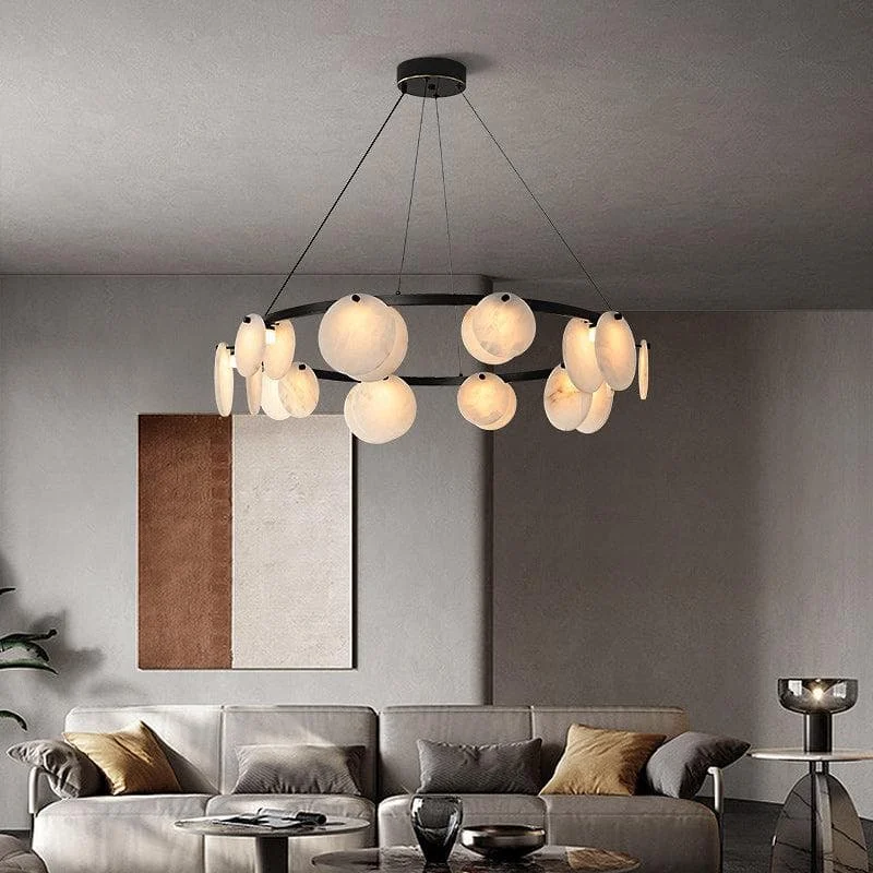This post-modern chandelier features a high-quality brass metal frame with translucent marble for a delicate texture. Highlight your taste and create a warm, bright and comfortable atmosphere in your room.