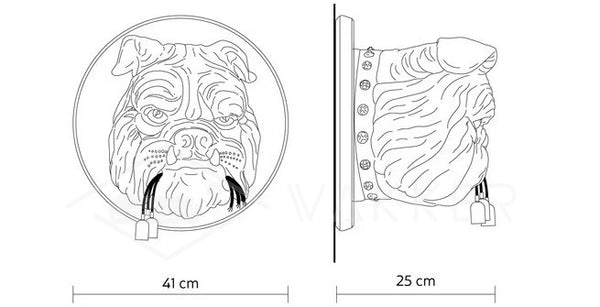 The Amsterdam Wall Sconce is part of a series of pieces that examine nature’s relationship to man. this fixture showcases the bust of an expressive bulldog rising from the wall to hold a ripped cluster of light bulbs in his mouth. Its resin composition adds to its structural detailing while the smooth matte finish lends a classic element. The light bulbs emit a warm glow that highlights the fine details within the bulldog’s angered expression.