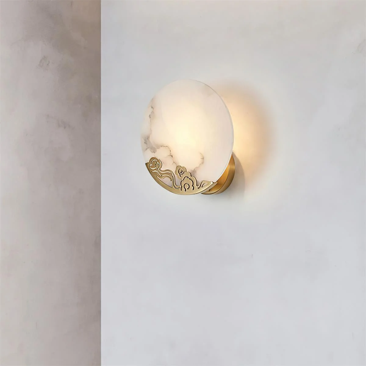 Ando Alabaster Wall Lamp in the warm glow of the natural alabaster shade of this wall lamp, a piece that stands out for its exceptional design aesthetics in any space. Each alabaster piece is a masterpiece of nature, its unique veining and hues emanating a subtle and mysterious luminescence under the illumination. Complemented by an exquisite brass body, it offers not only sturdy support but also a touch of classic elegance.