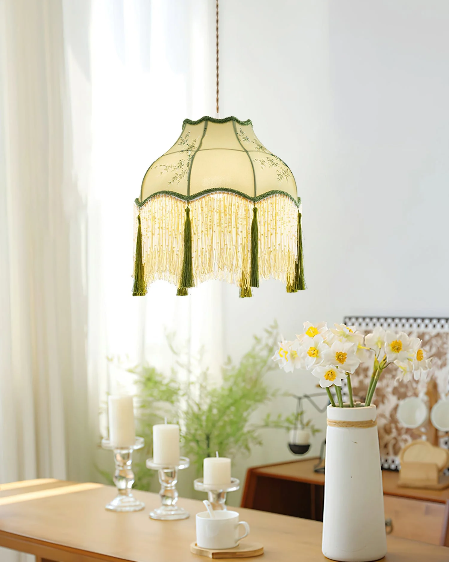 The Angelika Pendant Lamp is a stunning fusion of vintage elegance and oriental charm. Featuring a delicately handcrafted fabric shade adorned with a subtle bamboo motif, this lamp exudes timeless sophistication. The graceful scalloped edges are accentuated by intricate braided trim, while the cascading tassel fringe adds a touch of retro glamour. With its exquisite craftsmanship and unique aesthetic, the Angelika Pendant Lamp is more than just a light fixture—it’s a statement piece that brings an air of nostalgia and artistry to any interior.