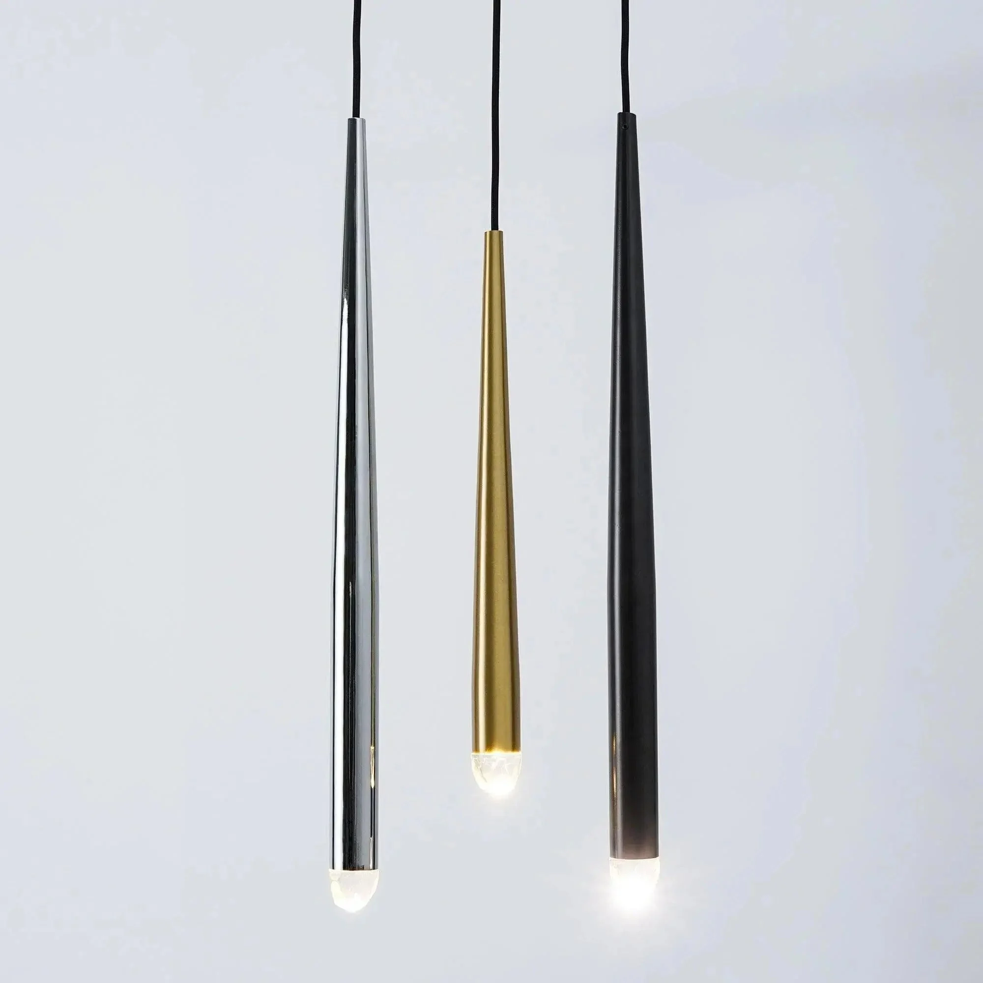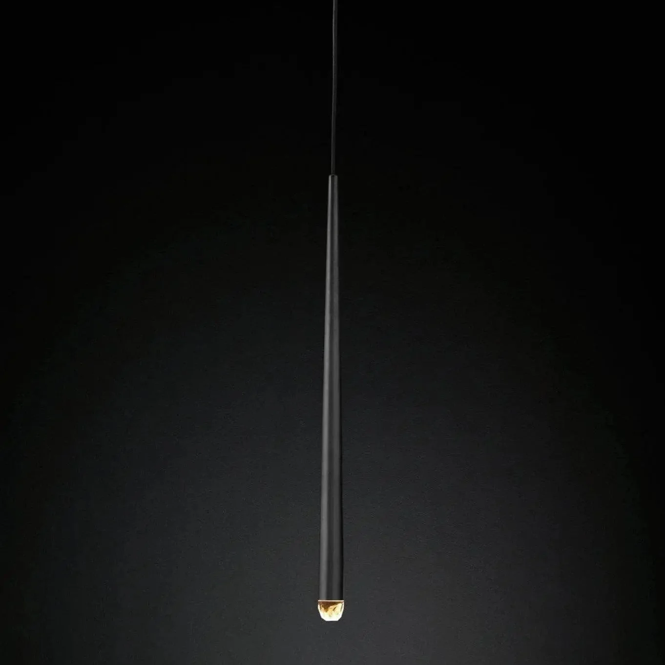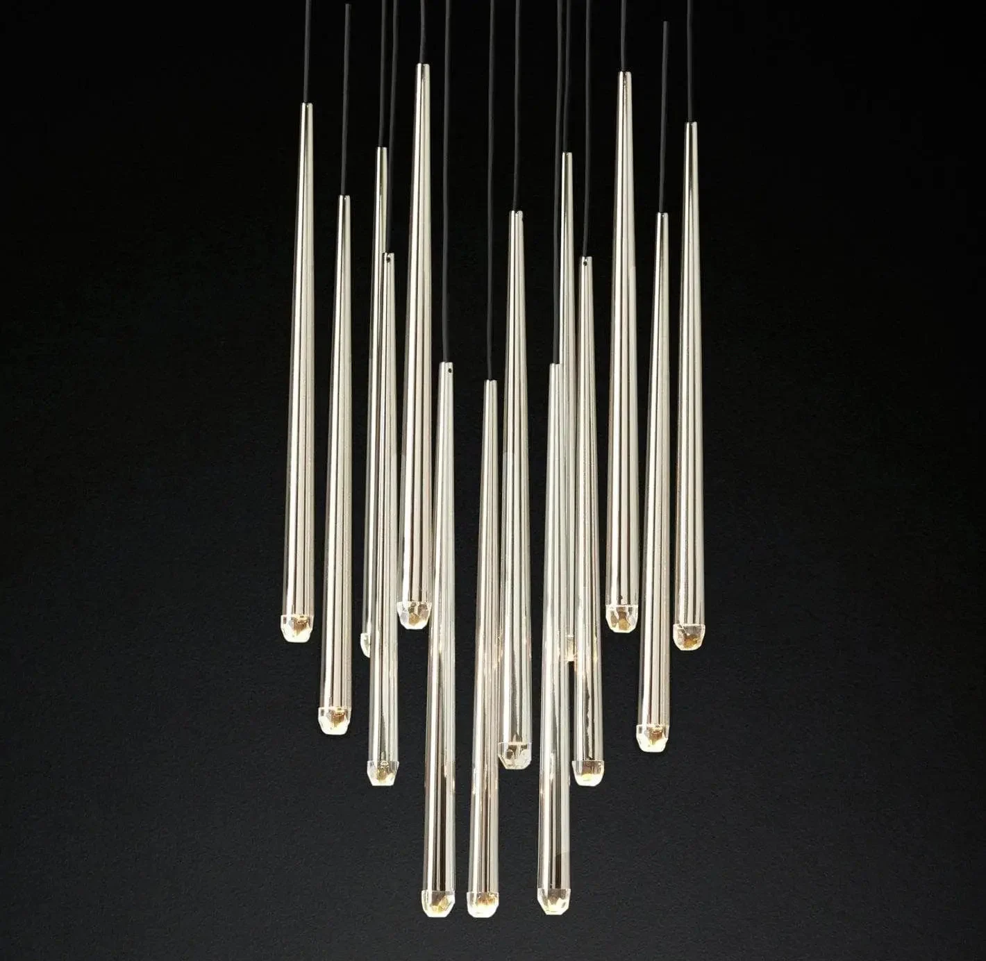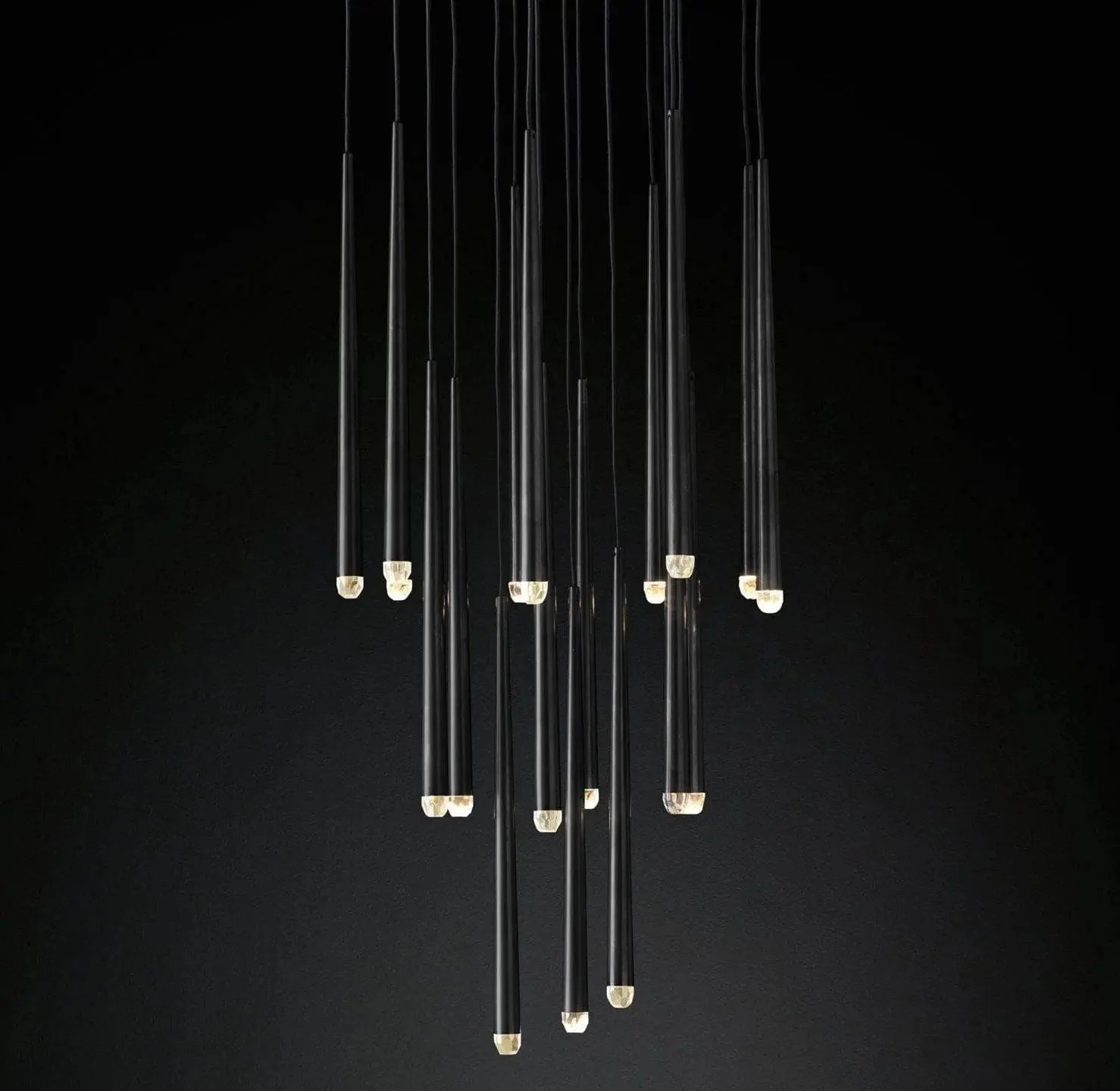Brass Spinal Tube Combination Chandelier | Inspired by French minimalist lighting of the 1960s, Jonathan Browning’s elegant design features a cluster of solid brass forms suspended from slender black cords.