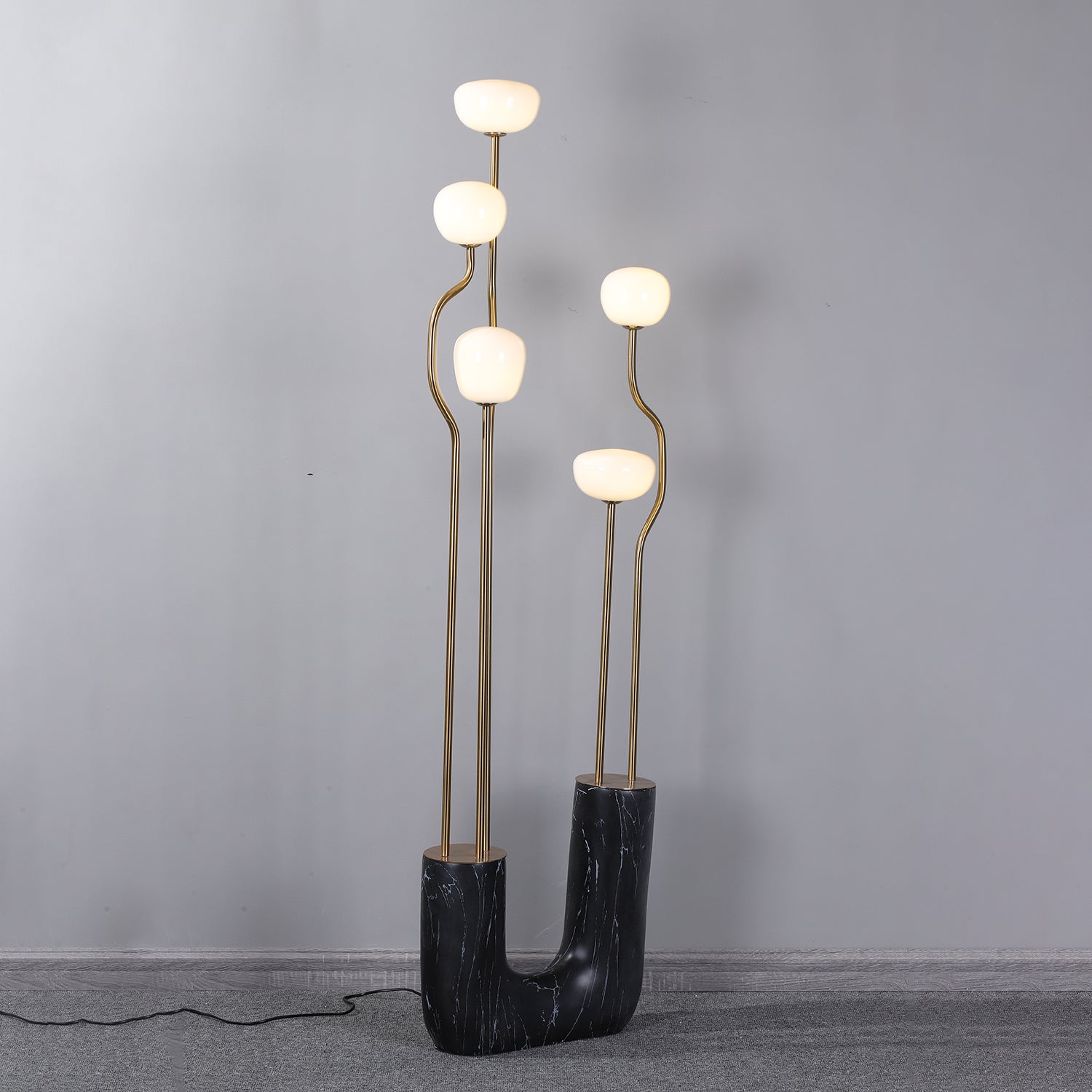 The Aria Bloom Floor Lamp combines sculptural artistry with functional lighting. Its elegant, curving stems rise from a sturdy black marble base, holding luminous white globes that resemble blooming flowers. This sophisticated piece adds height and a sense of organic beauty to any interior space. Whether placed in a living room or a grand hallway, the Aria Bloom Floor Lamp creates a warm, inviting ambiance. Perfect for those seeking a statement piece that merges nature-inspired design with modern aesthetics.