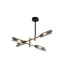Make a statement with the Astrid Double Chandelier, which features six glass shades. A light bulb is mounted at each end of the linear design. The frame is finished in vintage gold and black, completing and complementing the modern minimalist aesthetic.