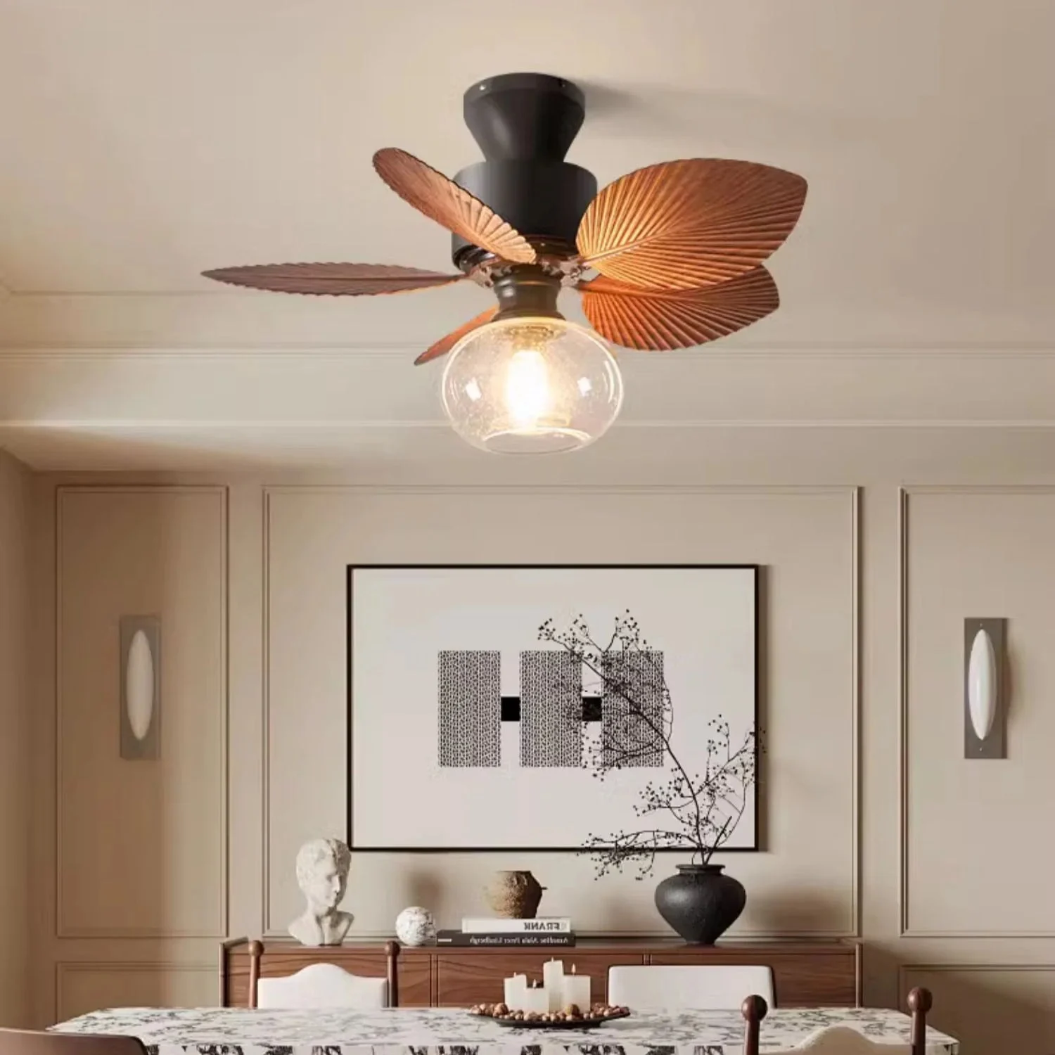 Transform your space into a tranquil oasis with the Banana Leaves Round Glass Ceiling Fan Light. Its handcrafted banana leaf blades bring a touch of nature indoors while its powerful motor cools and illuminates your space. Perfect for any natural-themed room, this fan creates a soothing tropical atmosphere.