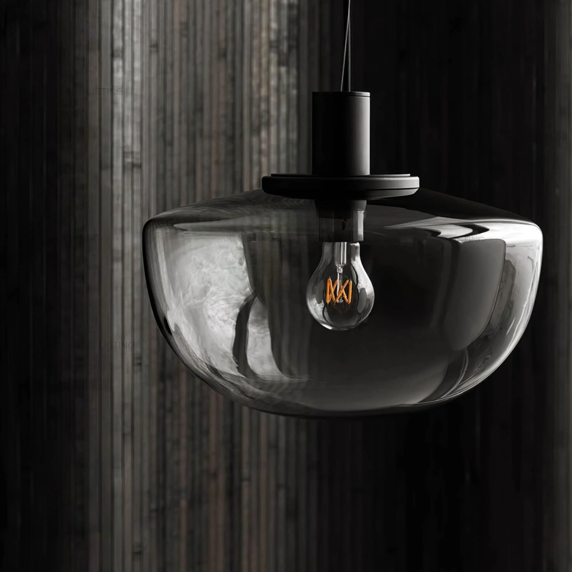 The Bank Pendant Lamp is handcrafted with luxurious white or smoke mouth-blown glass, suspended from elegantly black powder-coated aluminum fittings. Its graceful, semicircular design makes it an arresting presence in any room, adding a touch of modern sophistication to your interior.
