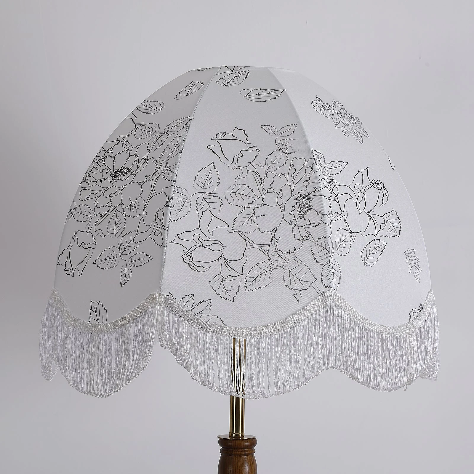 The Bari Fabric Floor Lamp features a classic design that perfectly blends traditional aesthetics with modern home decor. Its base is made from intricately carved wood, showcasing a vintage charm. The lampshade is covered in elegant white fabric with delicate fringe detailing, adding a touch of soft, vintage flair. The gentle light filtering through the fabric shade provides a cozy illumination for your reading nook or relaxation area.