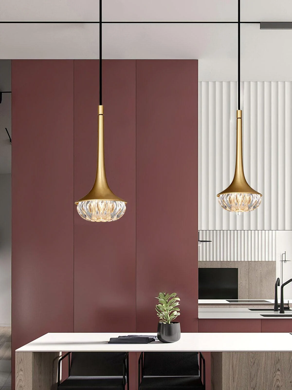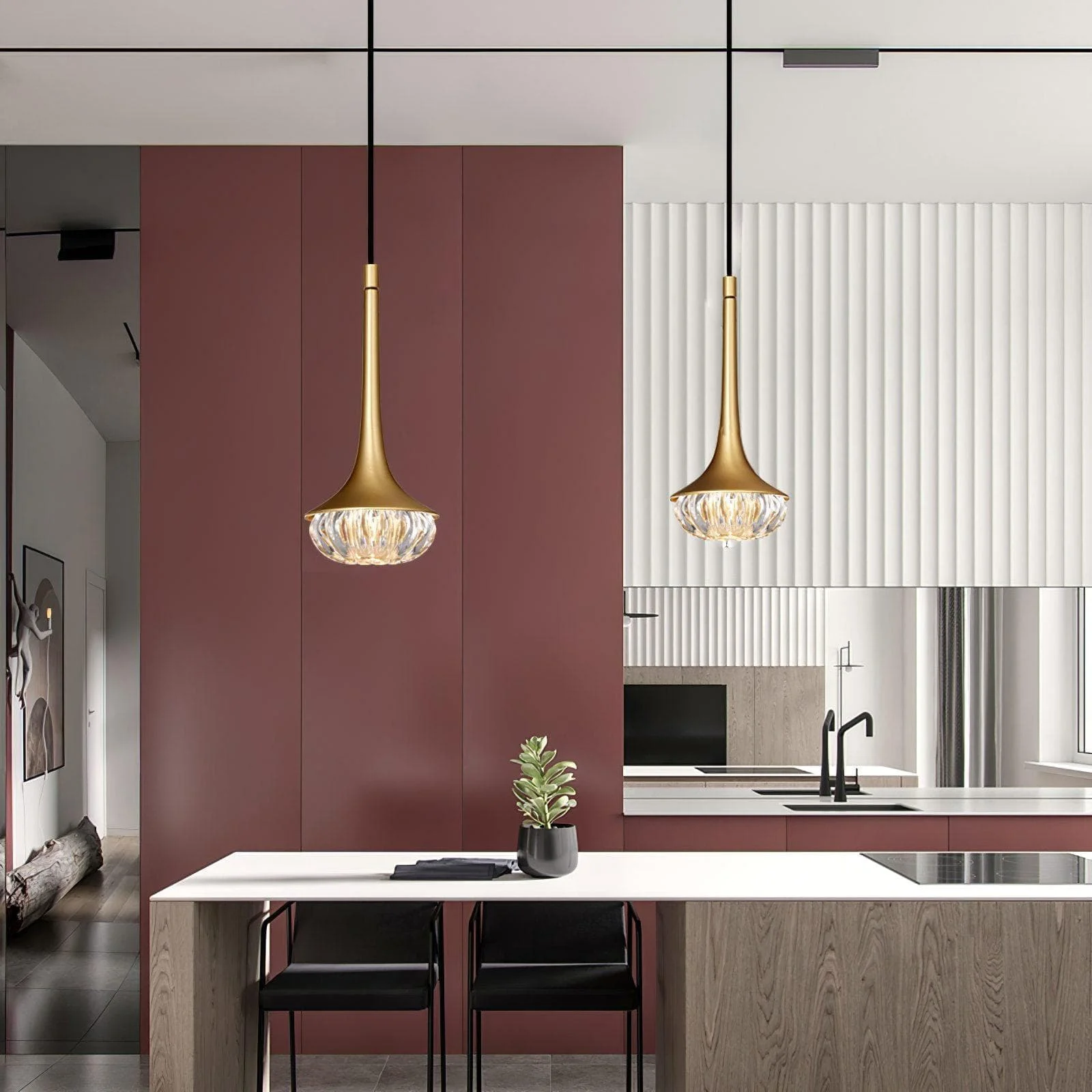 Bring an exotic touch to your favorite interior with the Bella Mini Pendant Light. This fixture features a shiny metal flared shade holder and a triangular patterned glass shade. This Moroccan-inspired teardrop chandelier stands out in a breakfast nook, acts as dramatic foyer lighting, or flanks a fine mirror or artwork.