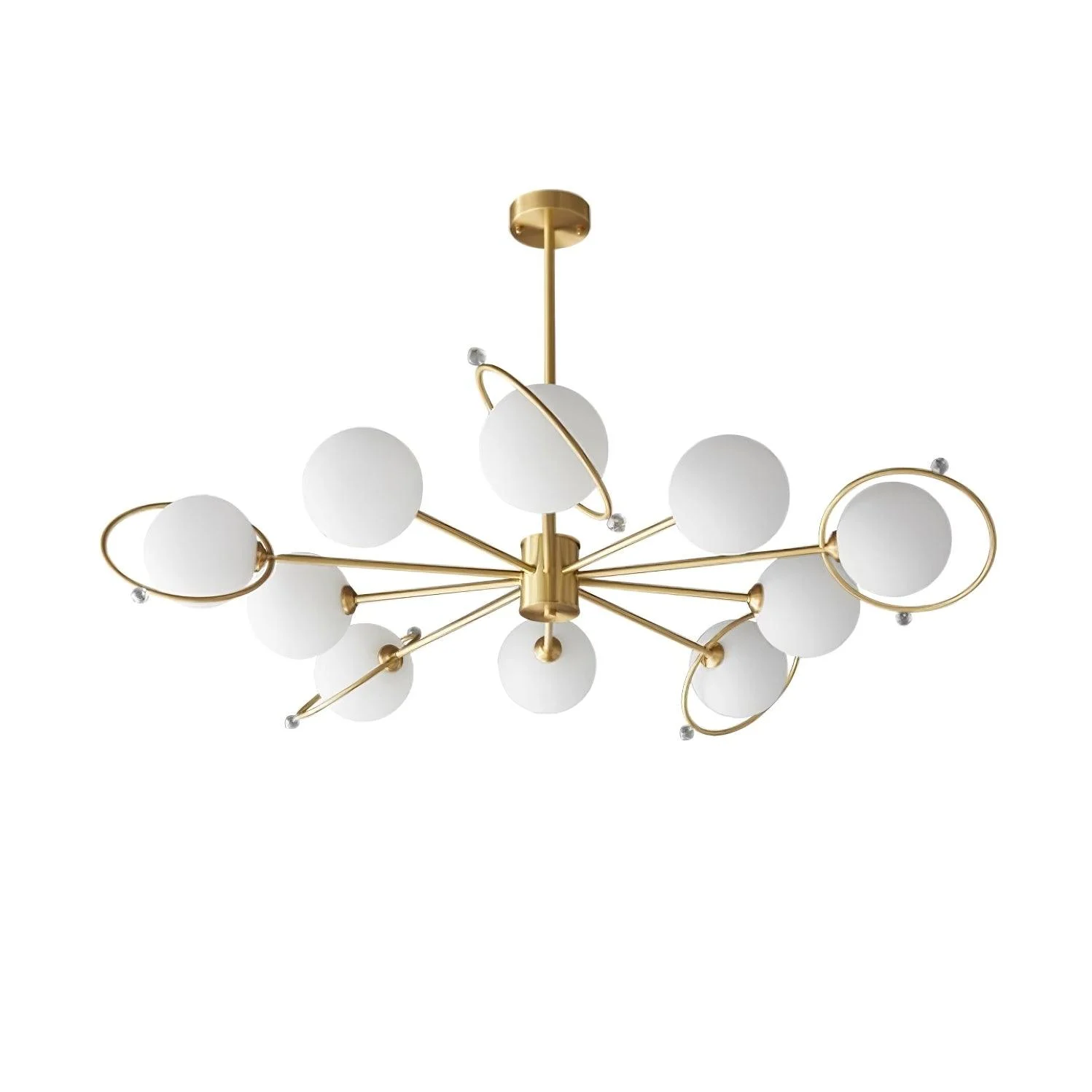 Elevate your space with the Bellamy Brass Chandelier, a harmonious blend of art and light. This statement piece, with its golden brass arms that reach out like the rays of the sun, holds aloft opal orbs that cast a soft, even light. Each globe is ensconced in a delicate brass halo, adding a celestial touch to its design.
