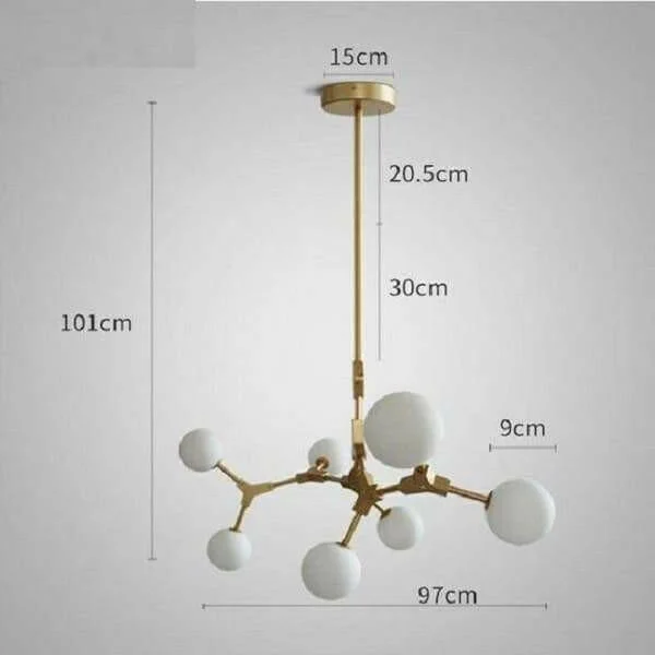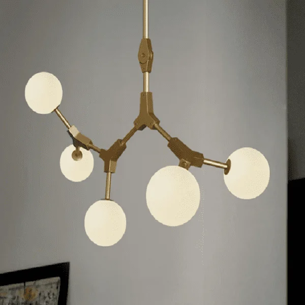 The Bernard – Molecular Ceiling Chandelier is a modern and unique lighting fixture designed with a gold dynamic structure. The dynamic structure allows you to place the arms in positions to design the body structure to best suit your desires. The bulb globes are frosted, which creates a warm and inviting ambient light setting in your living area.