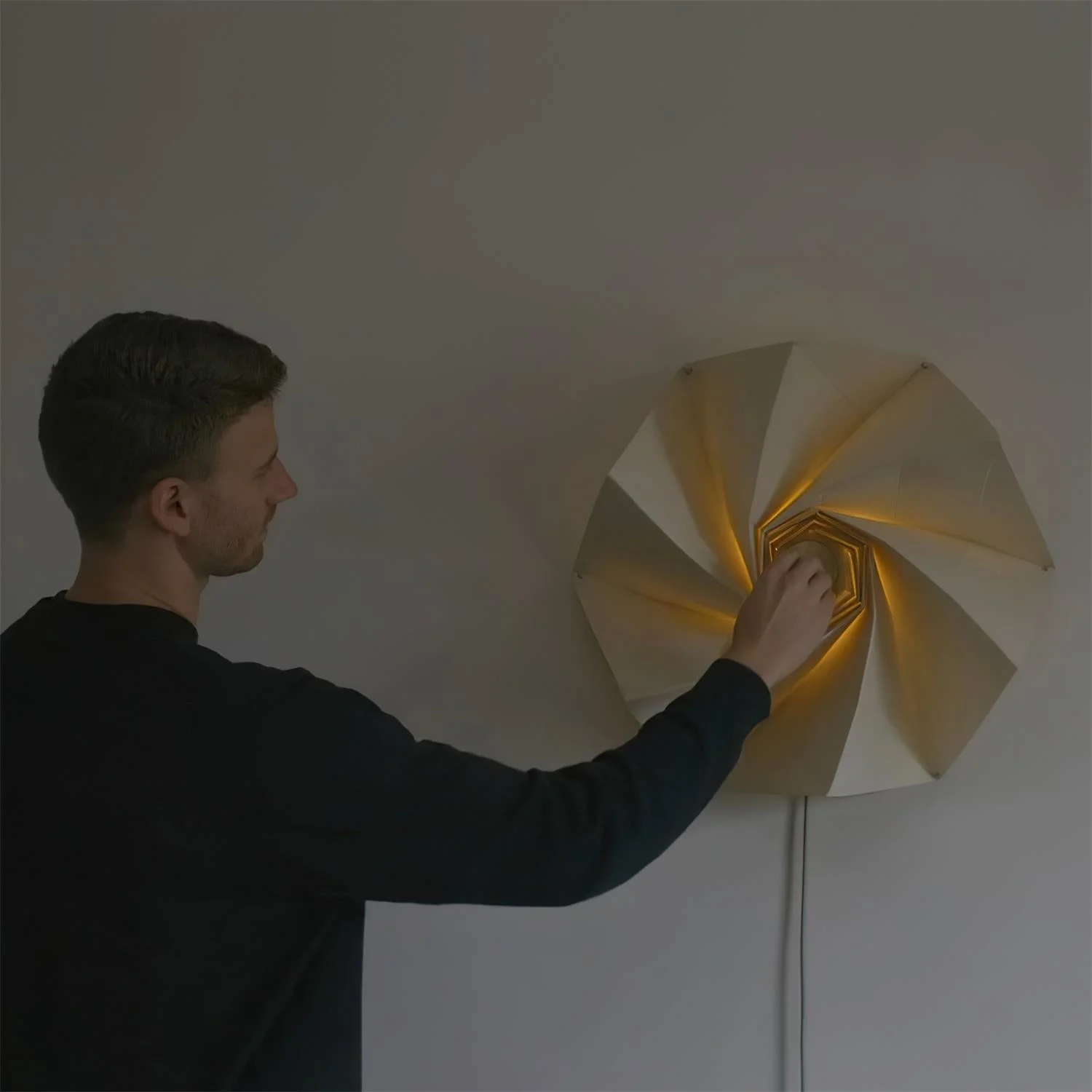 The Bloom Wall Lamp is a unique lighting piece inspired and the elegance of flowers. This wall-mounted luminaire provides a dimmed, diffused light when closed. A central dial mechanism allows the lamp to unfold, expanding in size and brightness. The design is not only functional but also a delightful addition to any living space, aiming to bring both light and joy.