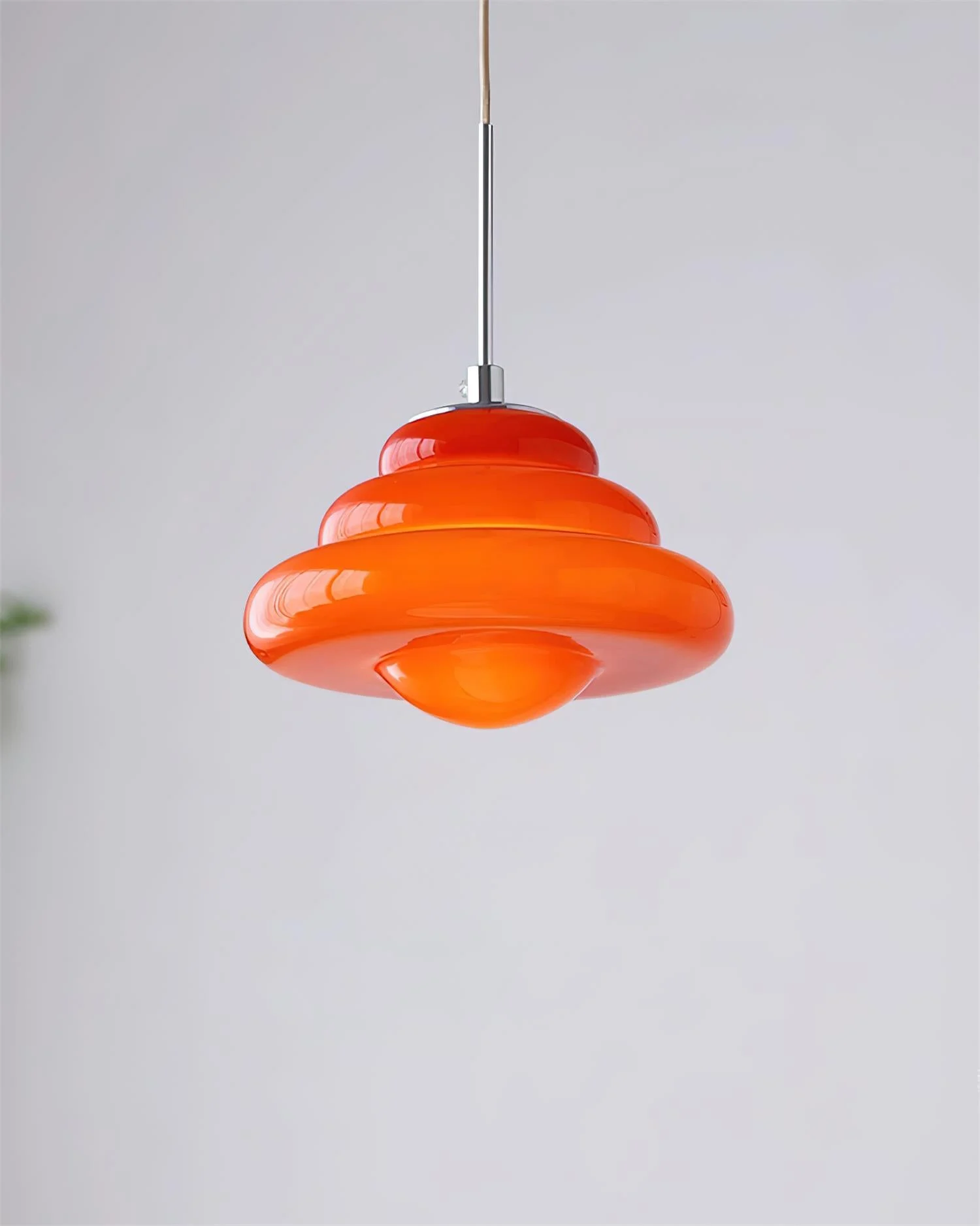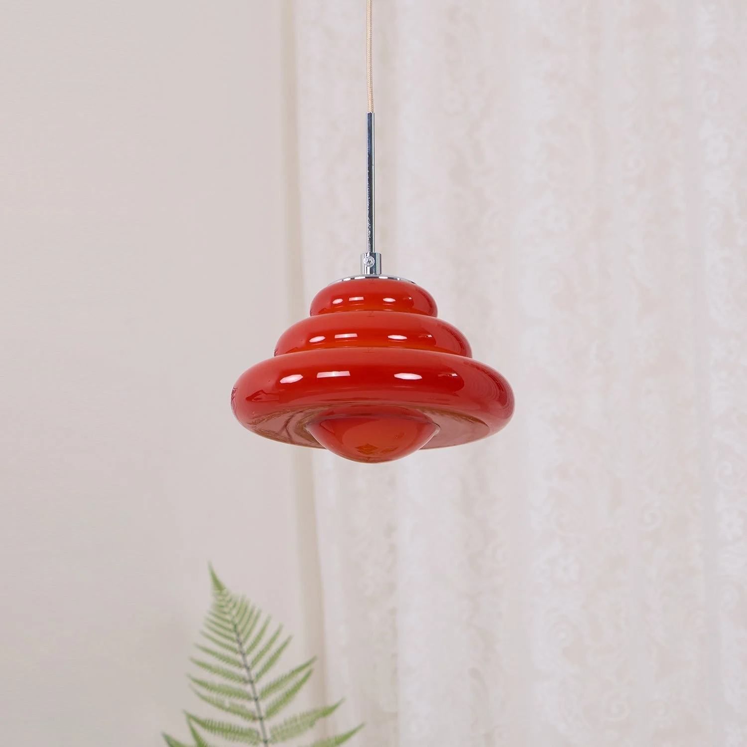 Make a bold design statement with this Art Deco-inspired pendant lamp. Its striking, layered shape and glossy finish create a captivating centerpiece for any space. Available in vibrant red and soft pink and Orange, this pendant light adds a pop of color and artistic flair to modern interiors.