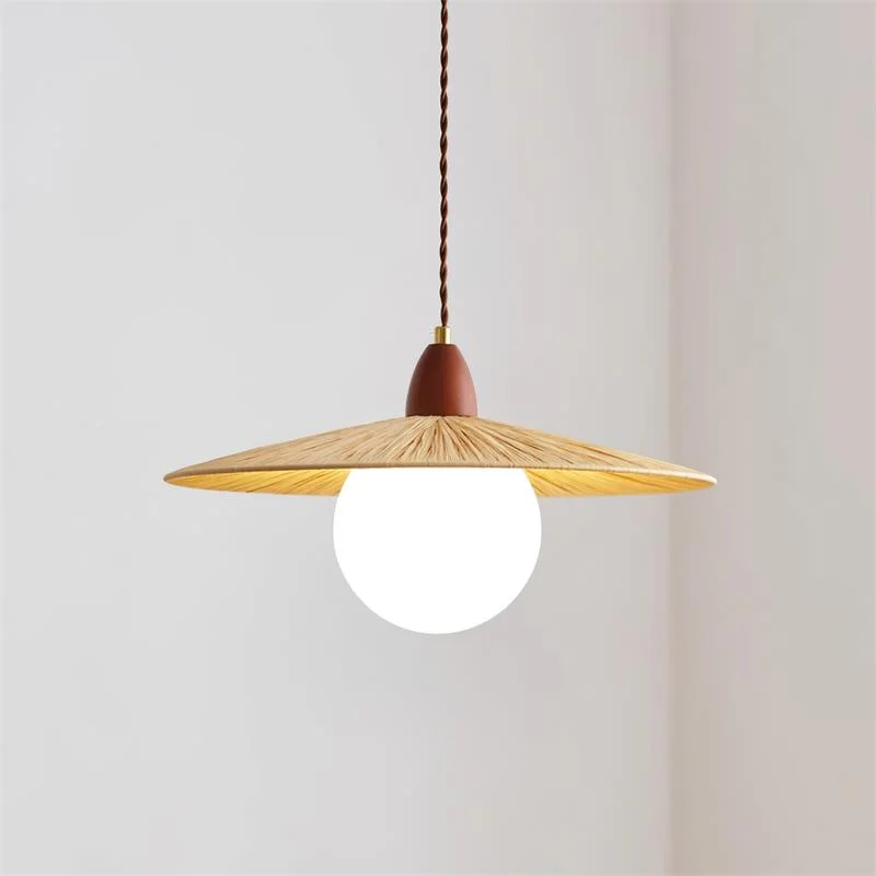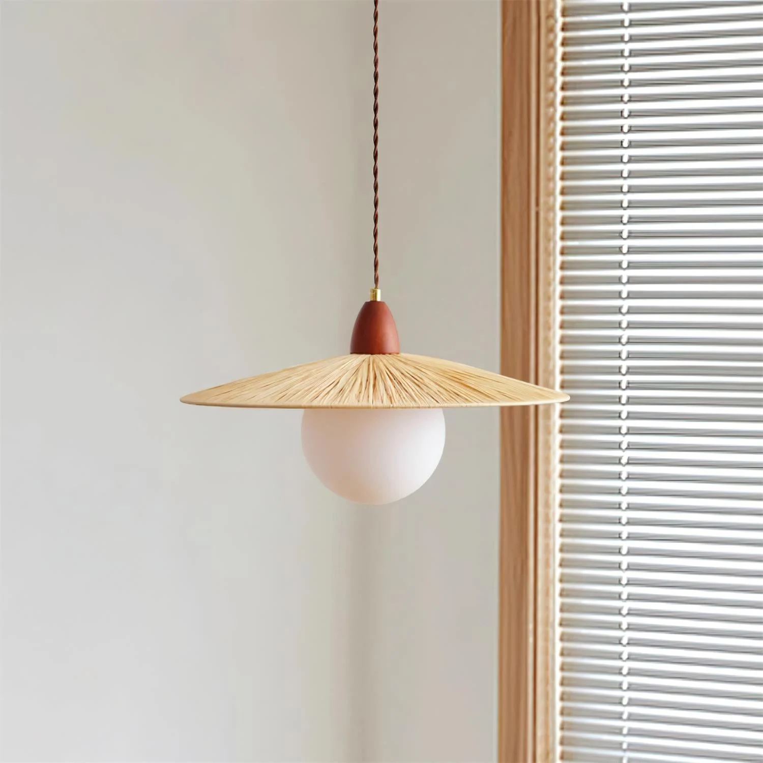 This distinctive lamp features a finely crafted Raffia shade, which elegantly diffuses the light to create a soft, ambient glow. Anchored by a rich, Walnut Color top, the lamp exudes a rustic yet refined aesthetic. Perfect for hanging in dining rooms, living areas, or any space that requires a gentle light and a touch of earthy charm, the Briuna Pendant Lamp is a testament to the beauty of simple, thoughtful design.