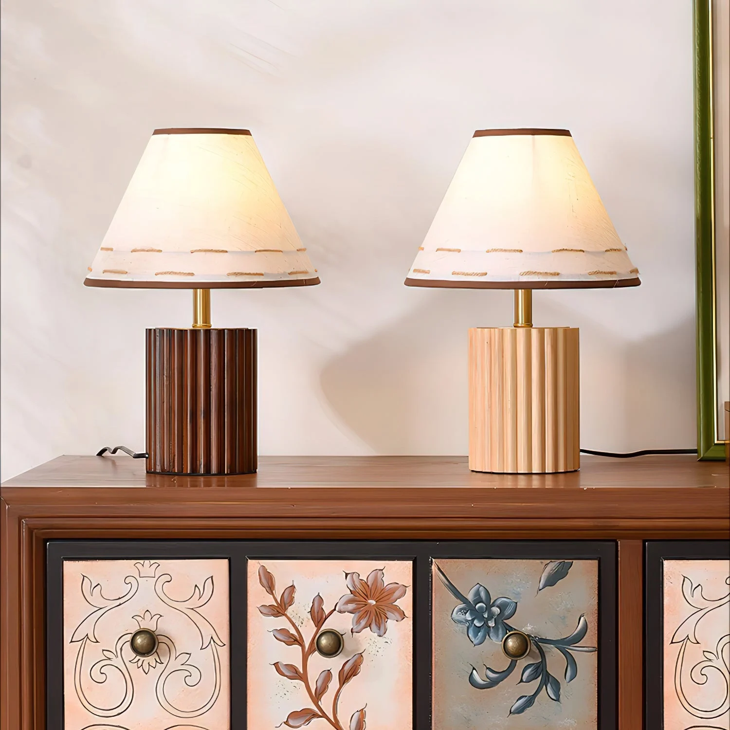 The Brooke Wooden Table Lamp by Docos exudes rustic charm and elegance. Featuring a cylindrical wood color base available in Walnut and light wood finishes, this lamp adds a natural touch to any room. The handmade lampshade, with its unique texture and design, softly diffuses light, creating a cozy and inviting atmosphere.