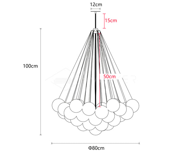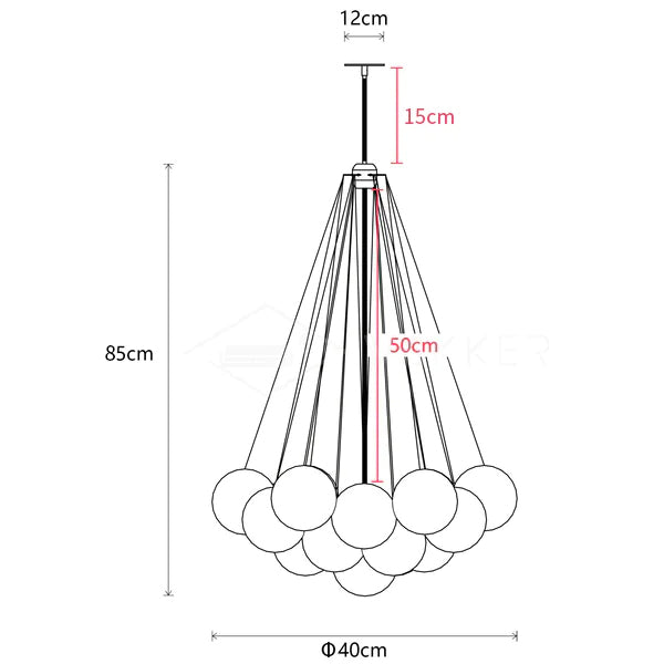 Glass orbs are frosted by hand to create an irregular texture reminiscent of 19th-century glass frosting techniques. Three central light sources emit a soft glow that is refracted through the surrounding cluster of orbs