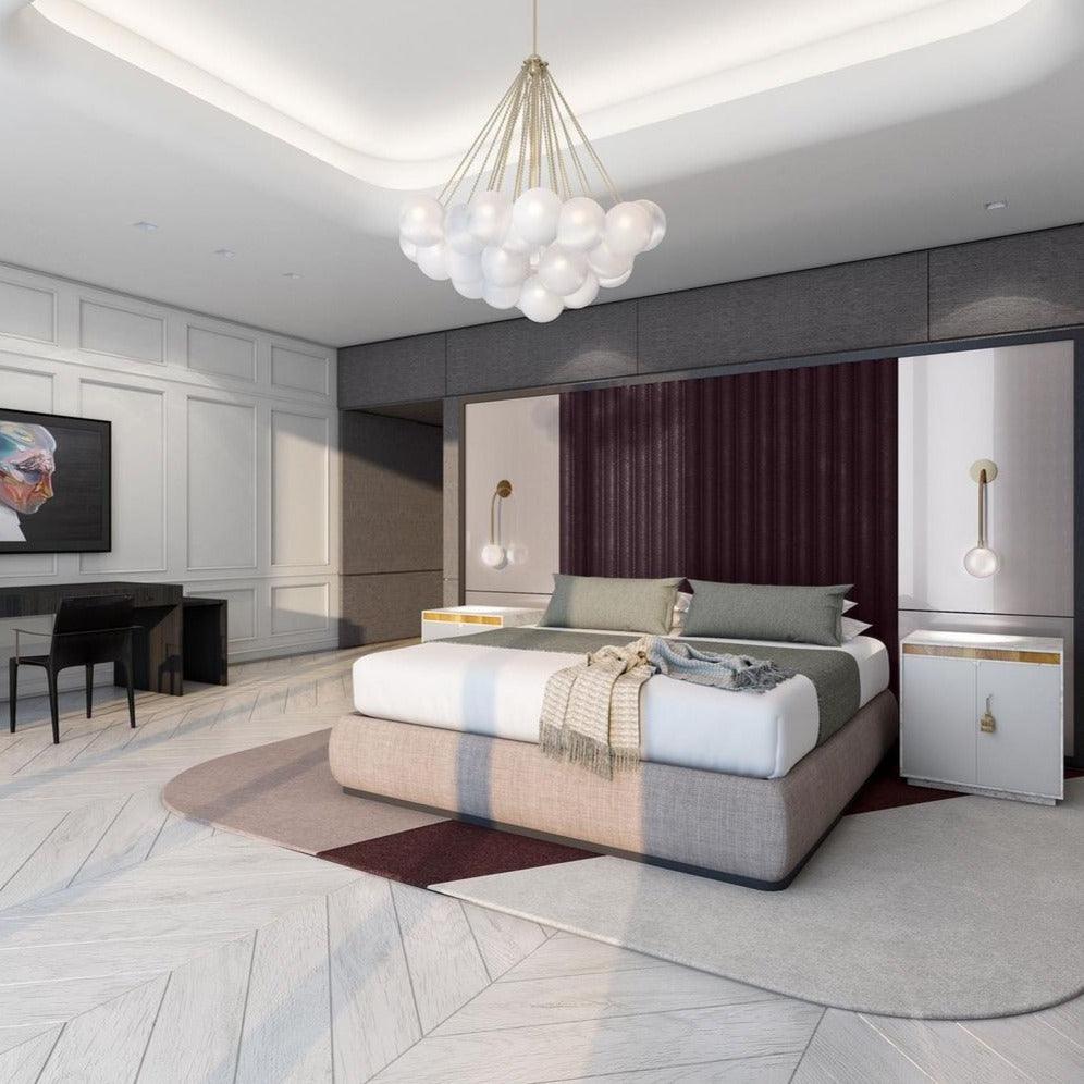 Glass orbs are frosted by hand to create an irregular texture reminiscent of 19th-century glass frosting techniques. Three central light sources emit a soft glow that is refracted through the surrounding cluster of orbs