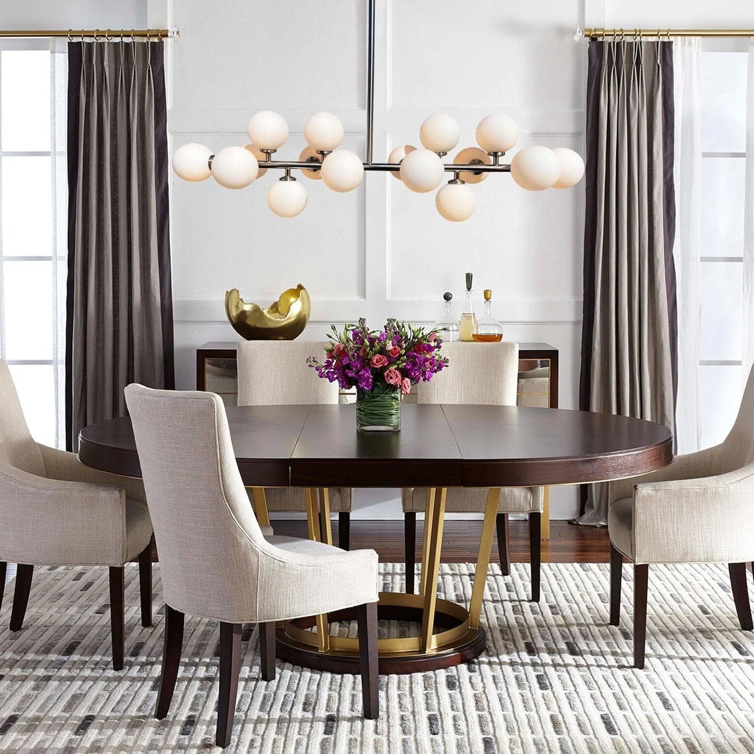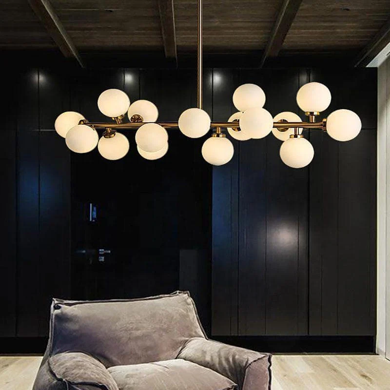 Large modern style chandelier inspired by the charming interiors of the 1970s, metal and brass finishes, glass balls create a diffuse and practical light source. The height can be adjusted in advance. The pendant lighting creates a unique atmosphere, with a clean, simple effect and a refreshing and relaxing effect. The combination of metal and glass adds an industrial style to your home.