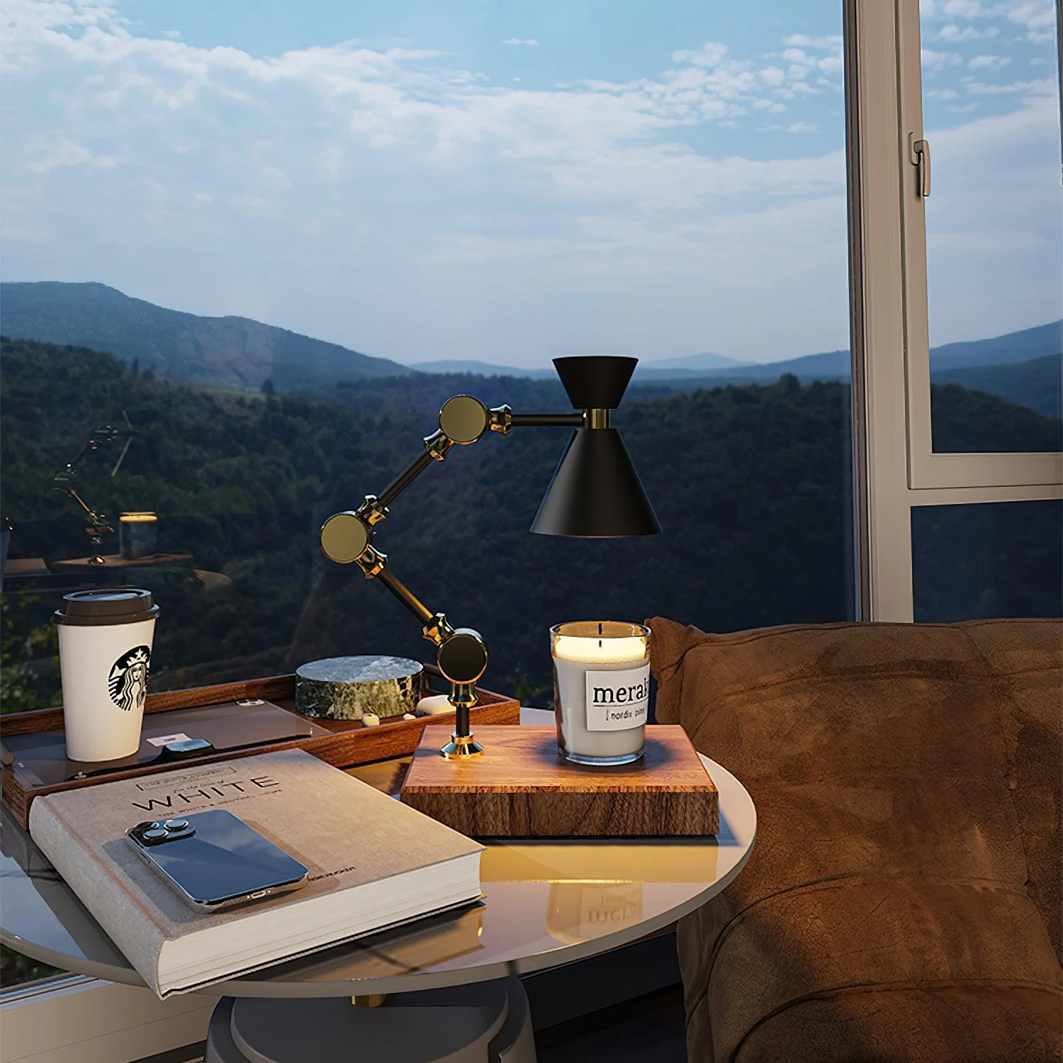 This elegantly designed aroma wax Cairo Candle Warmer Lamp that melds modern with classic elements. it stands as a piece of art designed to enhance the ambiance of your interior space. Its fine gold connectors and matte black lampshade complement each other beautifully, while the unique adjustable arm design not only increases functionality but also adds a touch of dynamic elegance.