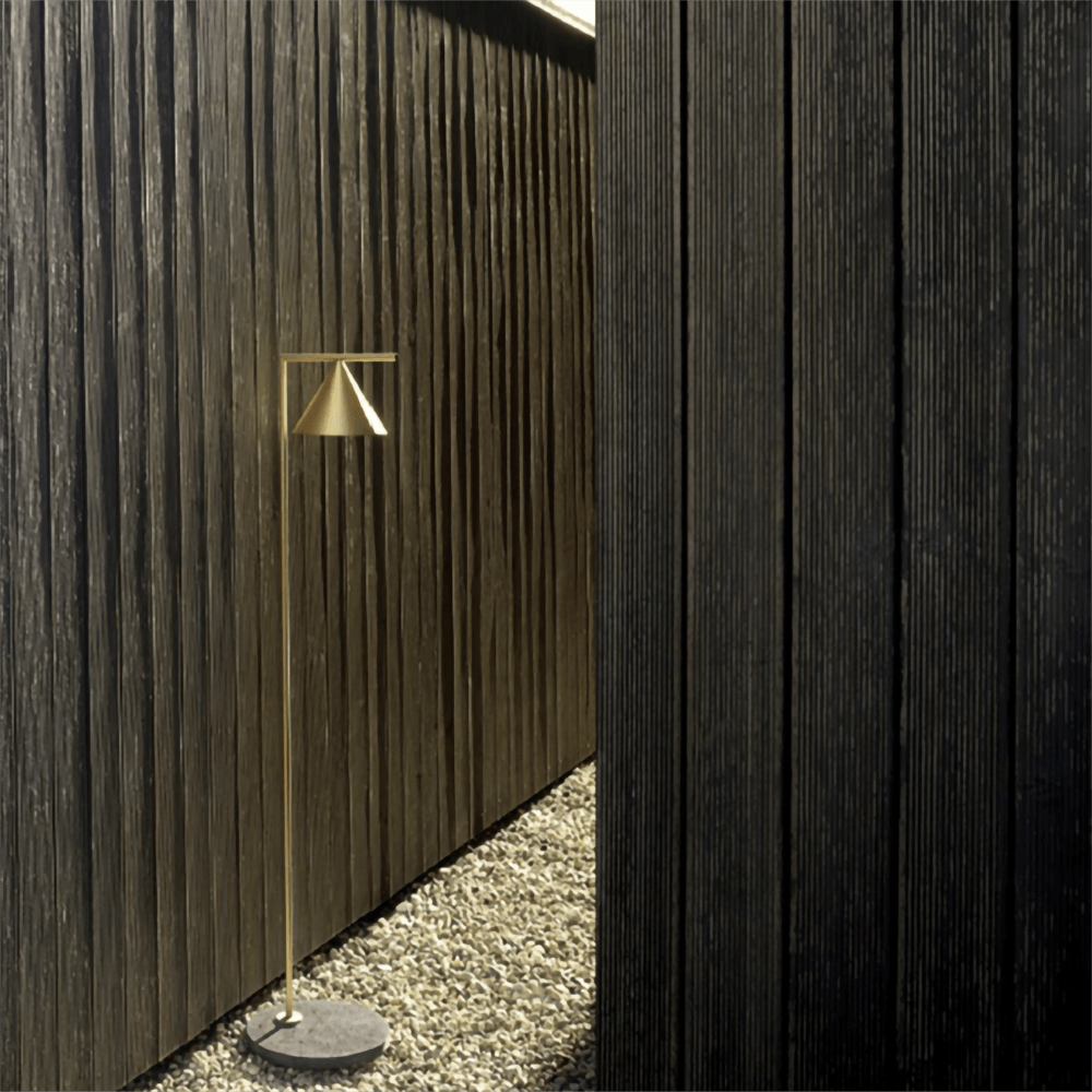 Sleek and graceful, this versatile floor lamp features smart details from head to toe. At the top, its spinning cone diffuser provides direct light that can be repositioned. On the bottom, it is weighted by a stunning white Carrara or black Marquina marble base. Its stem and cone are available in painted steel or brushed brass. The diffuser is an injection-molded opal photoengraved PC (polycarbonate). Its power cord measures 200 centimeters and features a foot switch with ON-OFF functions.