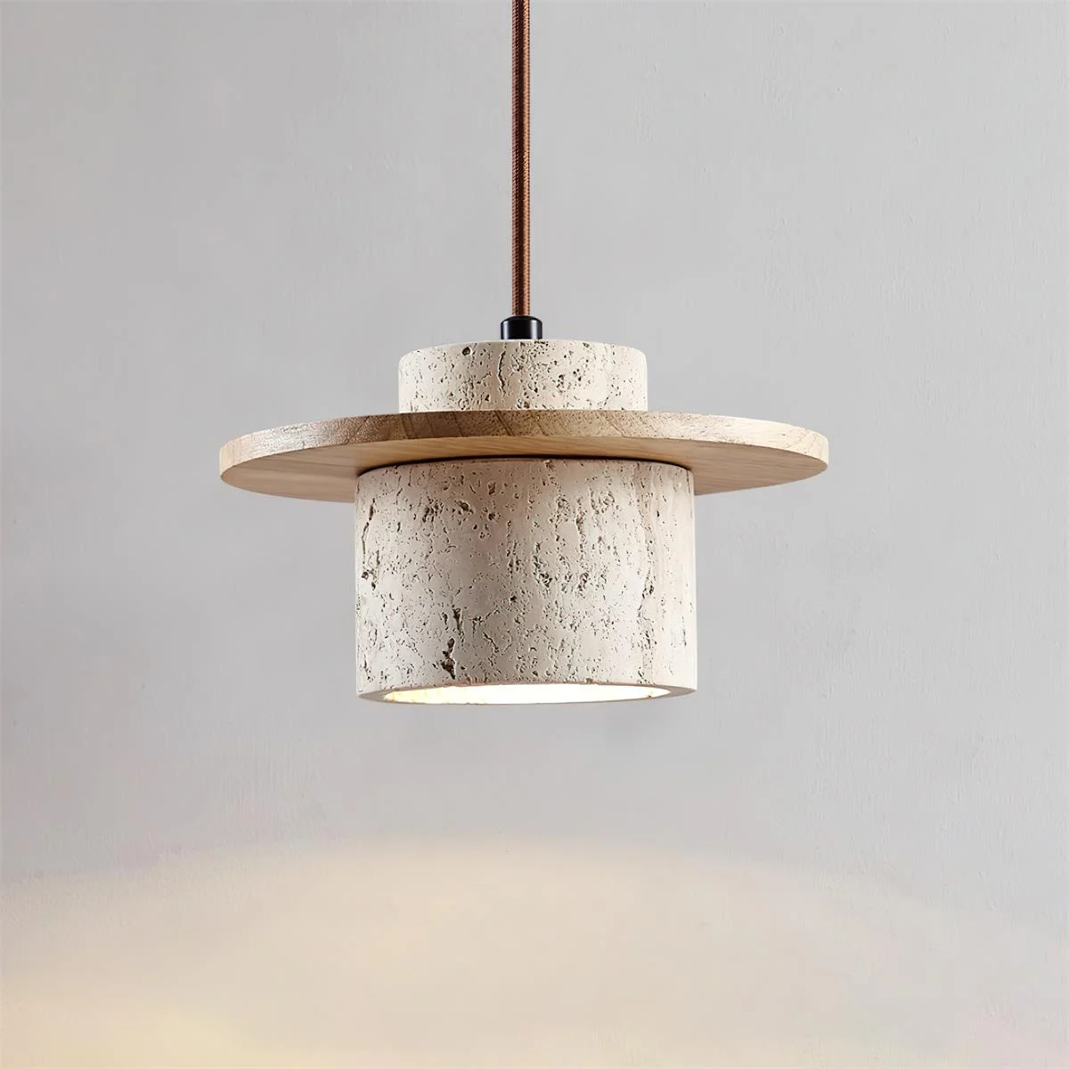 This Cata Stone Pendant Lamp combines rugged natural beauty with sleek modern design, creating a striking visual impact. Featuring a cylindrical shade crafted from natural stone, the lamp showcases an earthy texture contrasted elegantly by a smooth, dark wooden disc that caps both the top and bottom. This unique combination not only adds a tactile quality to the design but also enhances the ambient light that filters softly through the porous stone.
