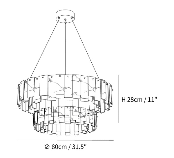 Elevate your space with the mesmerizing Celestial Alabaster Round Chandelier. Featuring a series of suspended alabaster discs, this chandelier effortlessly creates a celestial effect. Each disc is carefully placed to allow warm, soothing light to shine through the unique marble patterns. The brass accents add a touch of modern elegance.