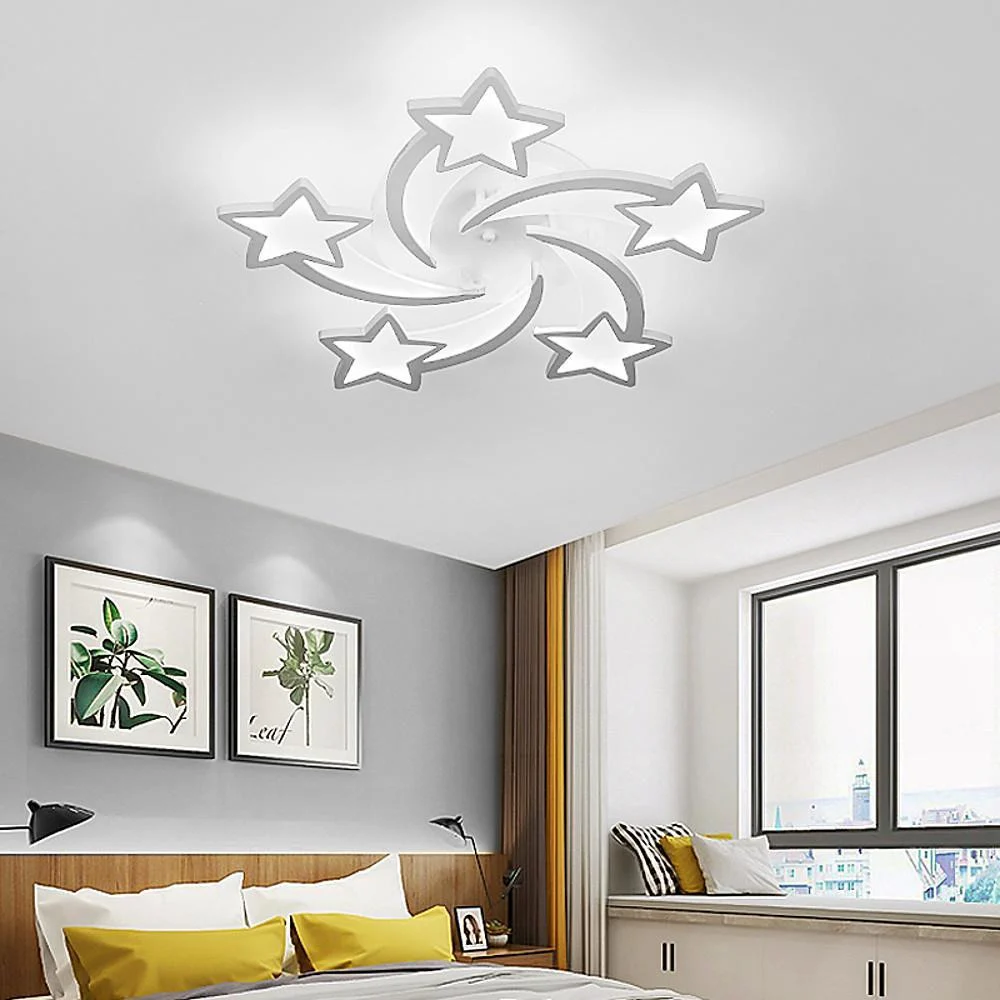 This Playful Childlike Shooting Stars Flush Mount Light is molded from high-quality acrylic, ensuring a soft diffusion of light that mimics the gentle glow of stars in the night sky. The crisp white finish of the iron frame adds a modern touch to this playful arrangement, making it a striking art centerpiece. The celestial charm of the Shooting Stars Flush Mount Light, a fixture that captures the whimsical allure of a starlit sky.