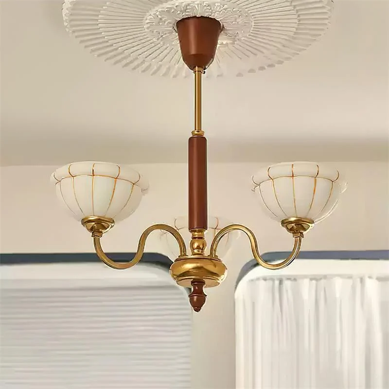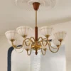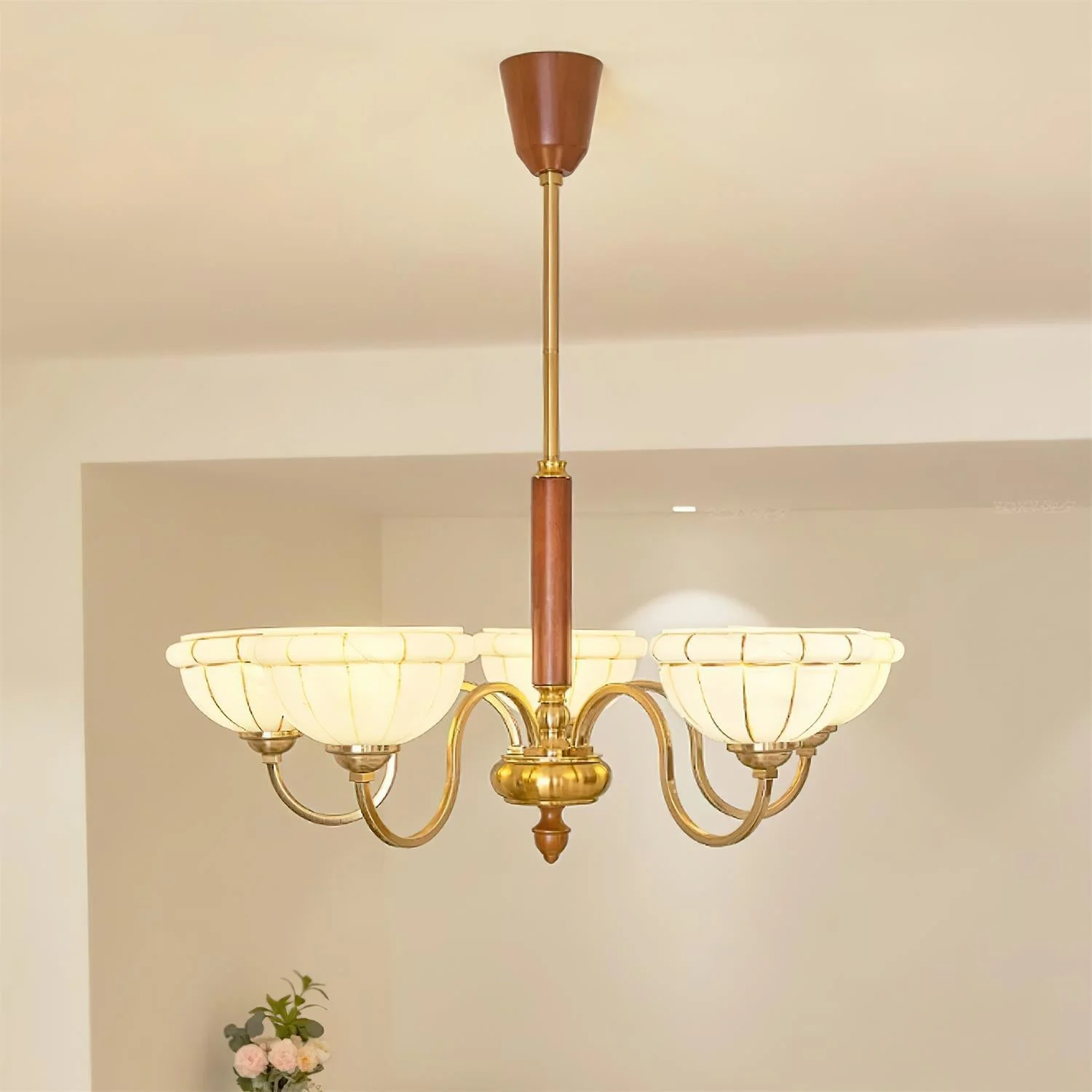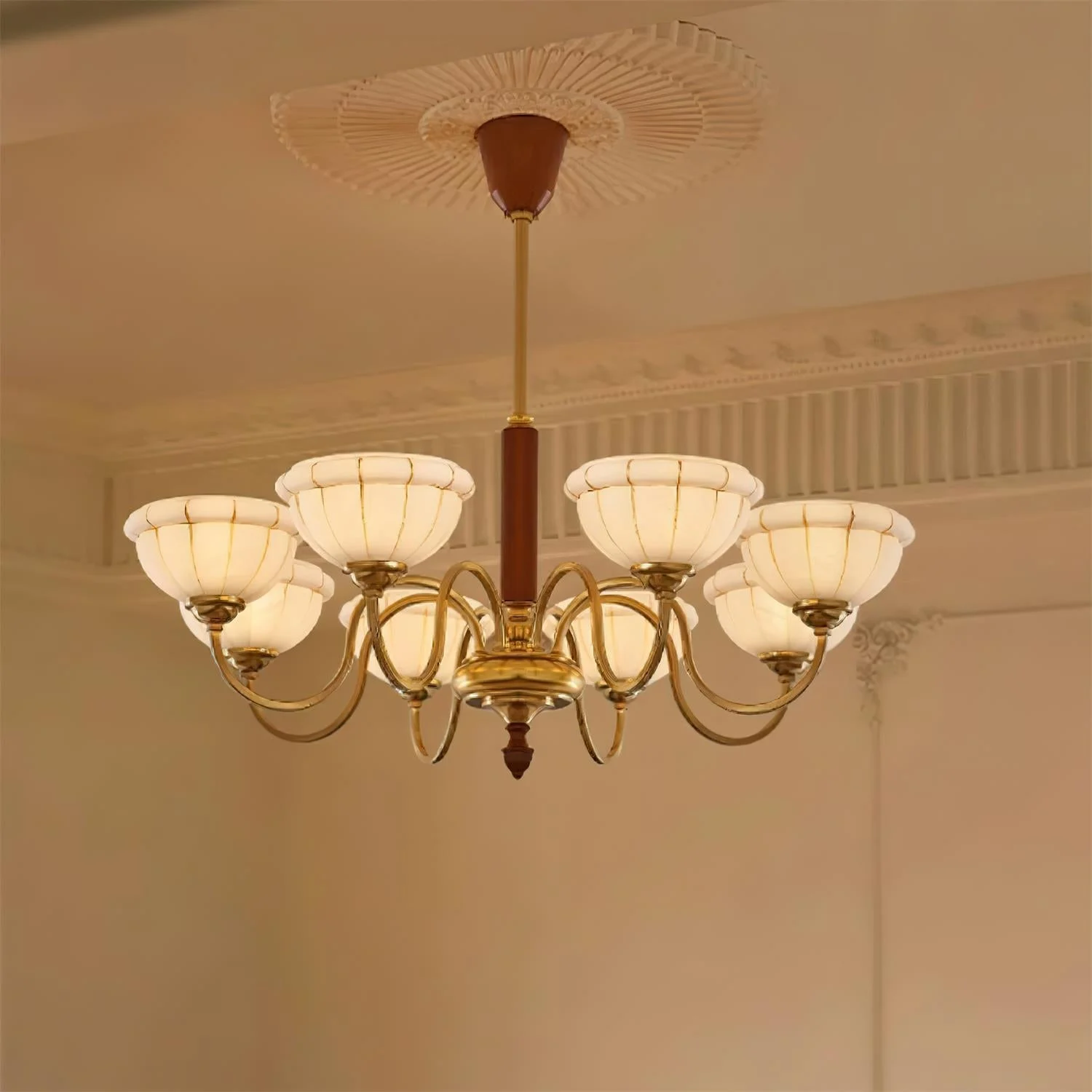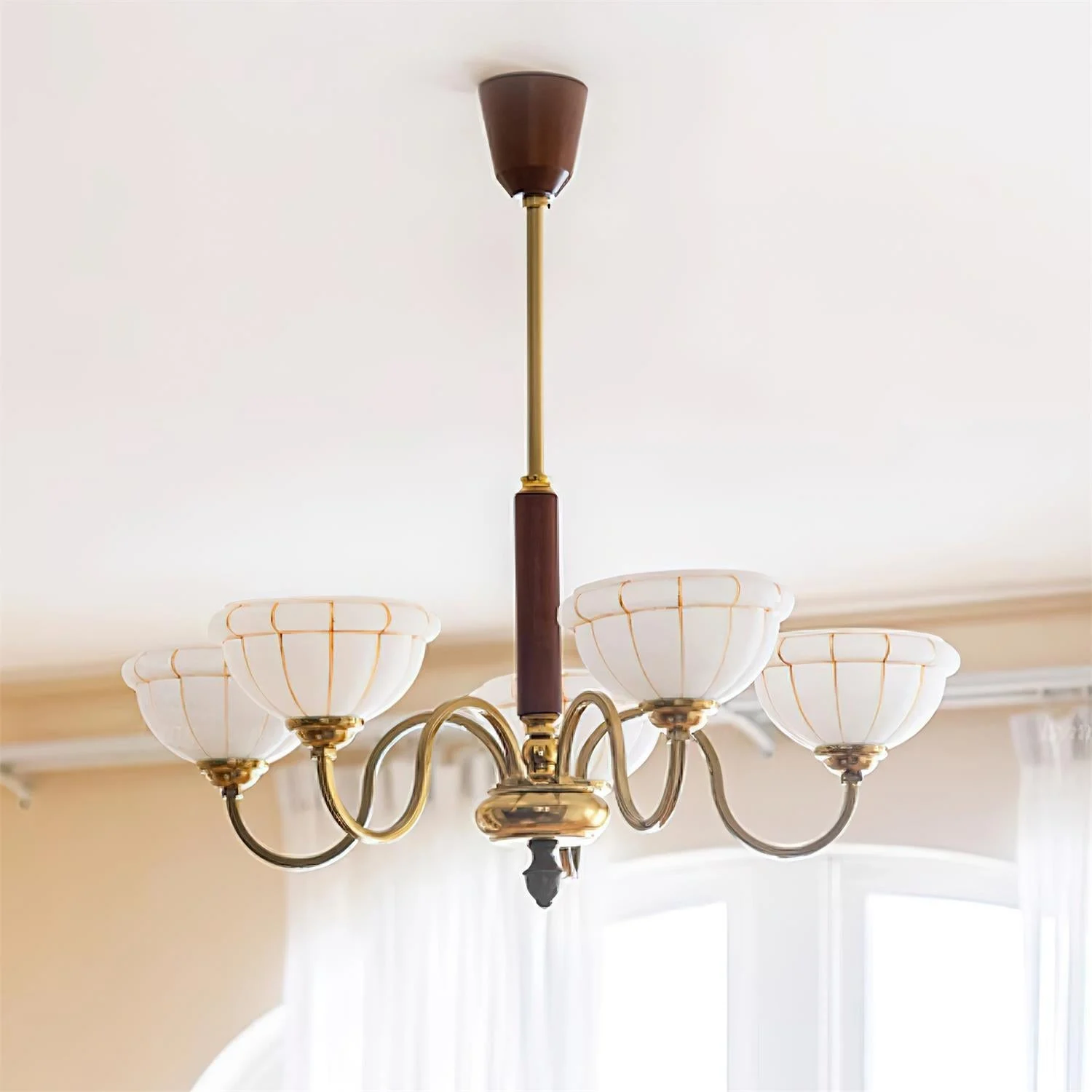 The Charlie Chandelier is a stunning fusion of classic elegance and modern craftsmanship. Its graceful, gold-finished arms curve outward, supporting delicate, flower-shaped glass shades that radiate a warm, inviting glow. The intricate detailing on the frosted glass, paired with the rich wooden accents, adds a refined touch of luxury. This chandelier is perfect for elevating dining rooms, grand foyers, or living spaces, providing both ambient lighting and a statement of timeless sophistication.