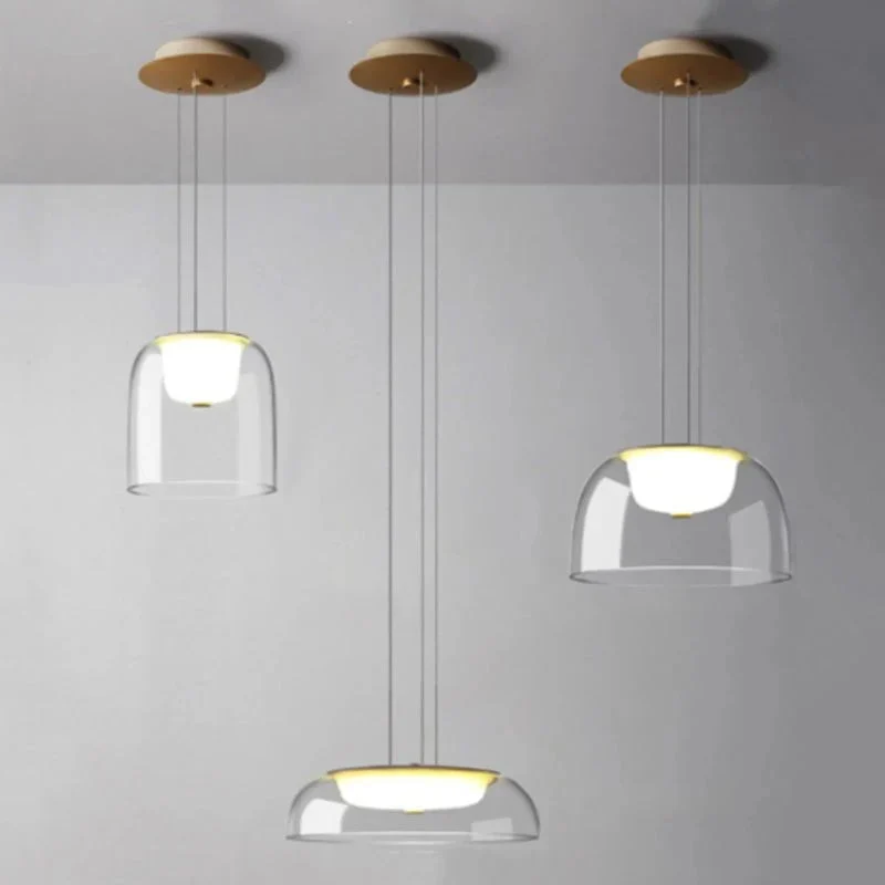 Clifton Glass Pendant Lamp, very beautiful, a beauty in itself. The double lampshade design creates the visual effect that the outer glass lampshade is suspended in the air. The LED panel wraps around the center of the lamp in a unique glass shape in 3 different designs, allowing the light to diffuse through the glass shade.