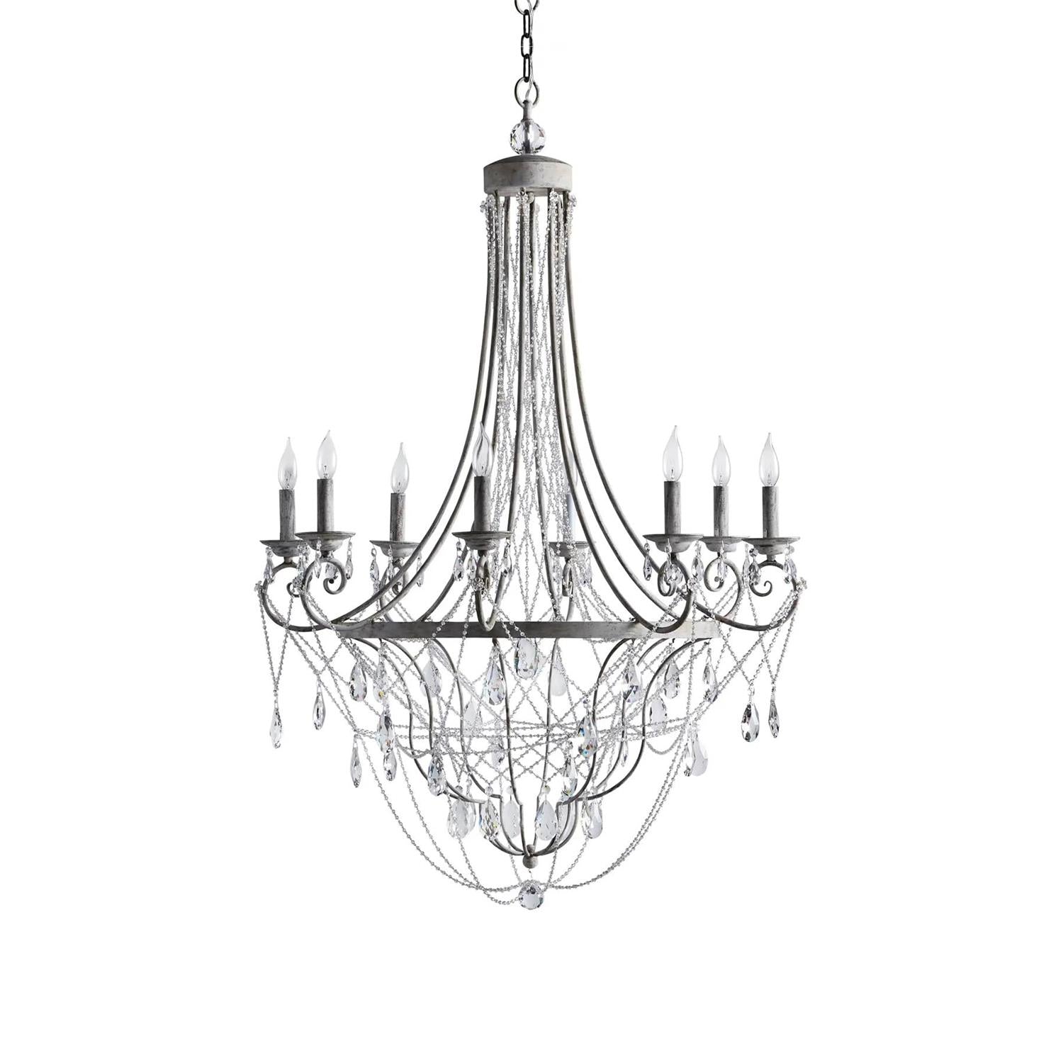 Traditional with soft feminine features,The Collier Crystal Chandelier exude time-worn French Country style.Collier’s defining features include floral-inspired bobeches, turning details onThe center column, delicate crystal strands and our NEW weathered gray-white finish.