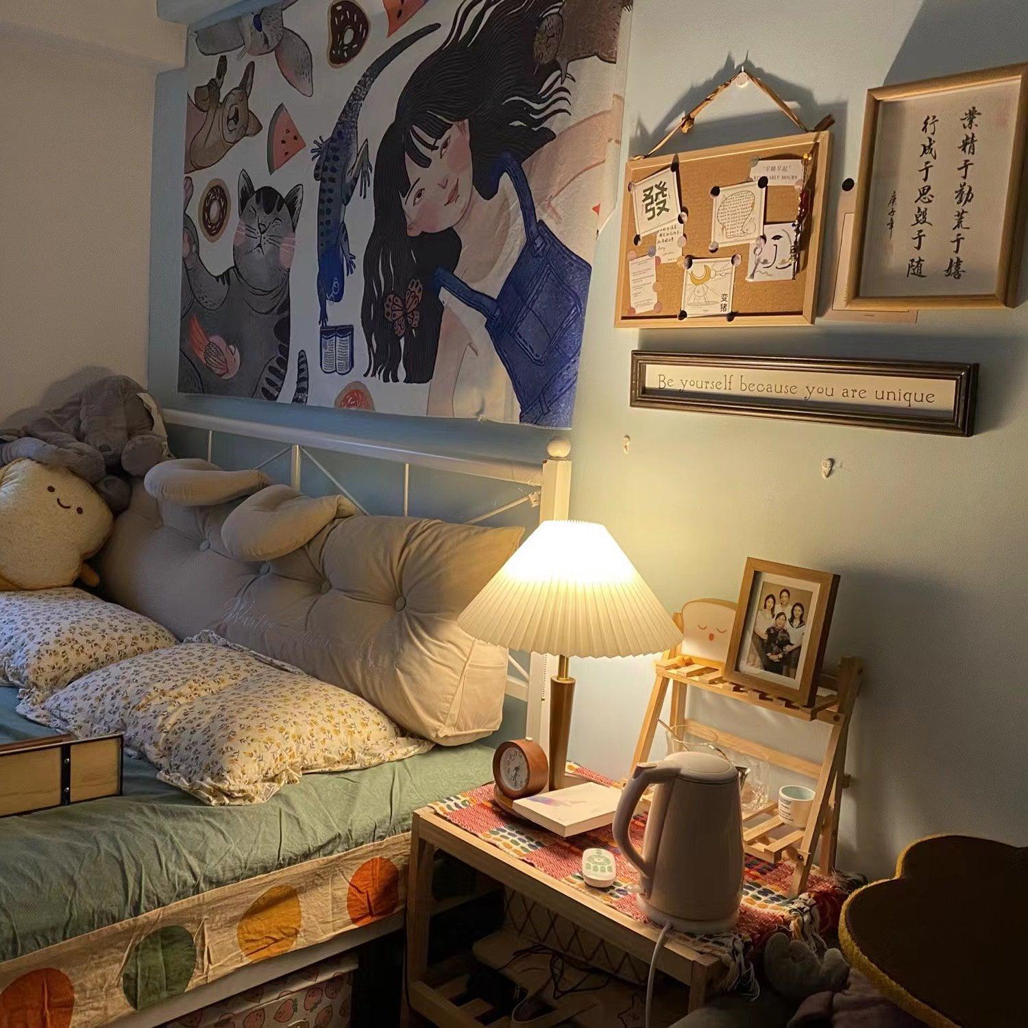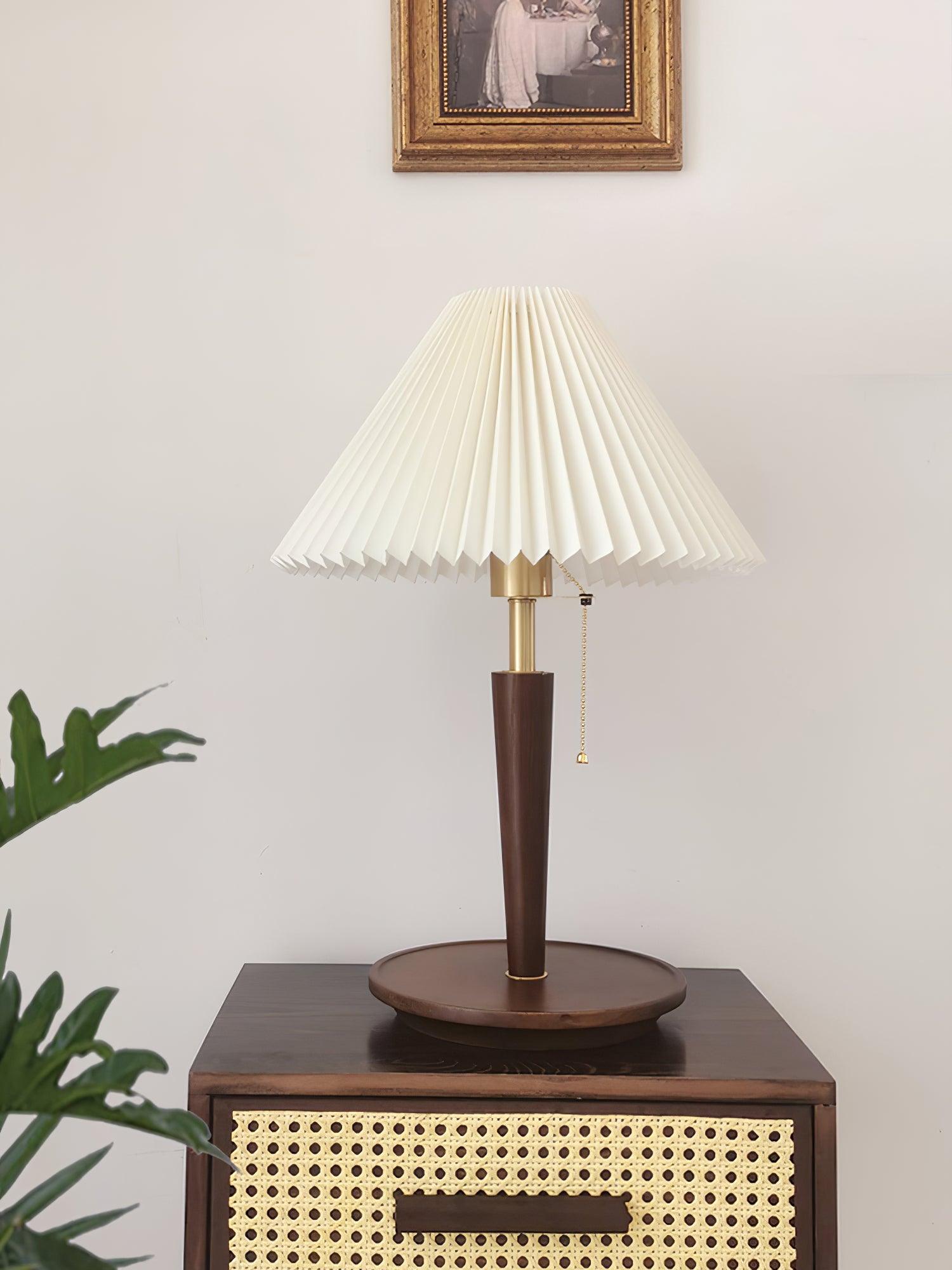 A Cone Pleated Fabric Table Lamp for Homelova. base made of solid wood and featuring a new white textured linen conical shade. The lamp body is decorated with golden brass.A very minimalist aesthetic.