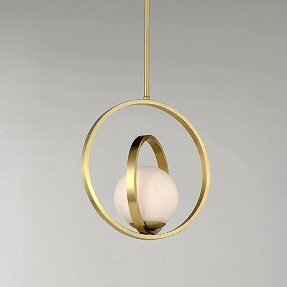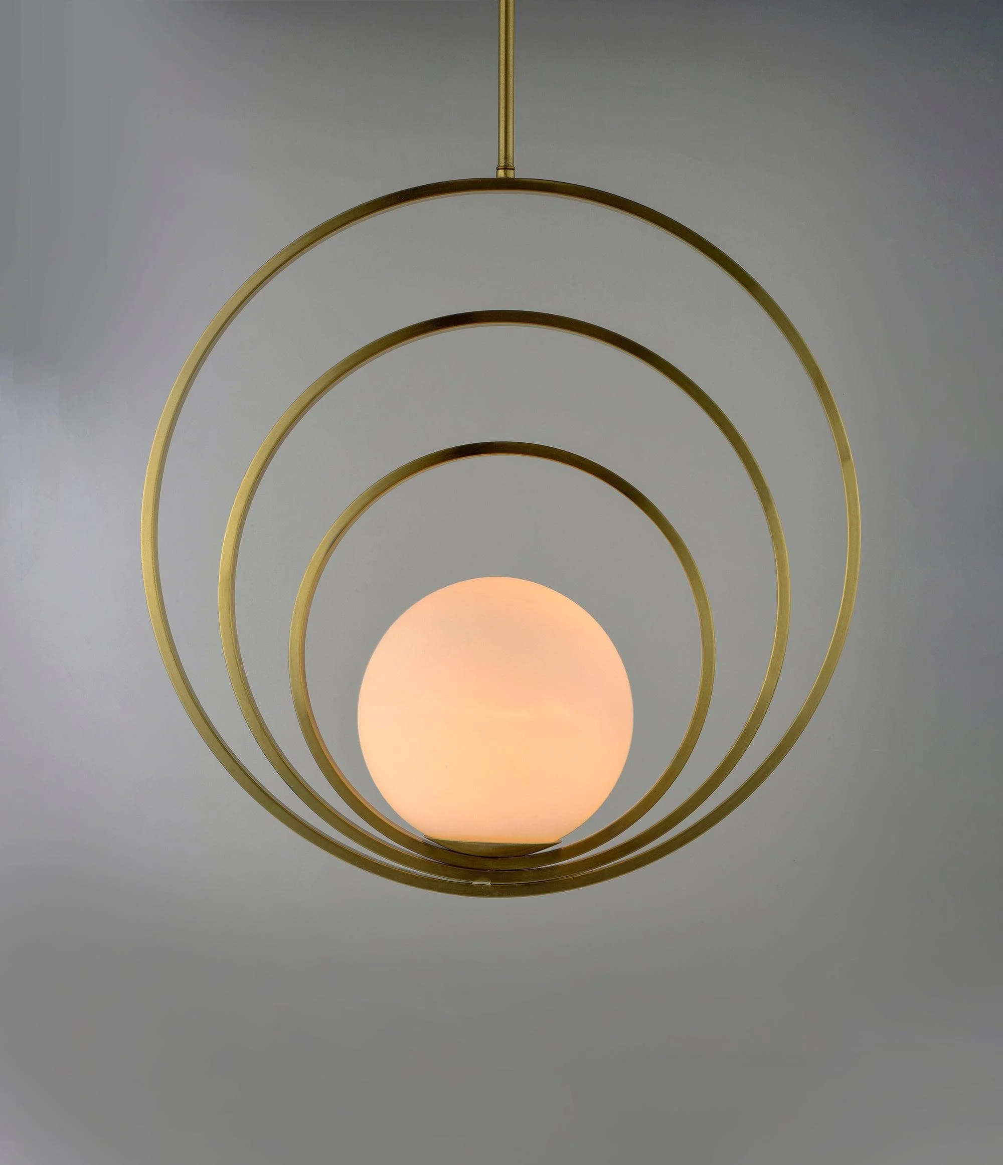 Adjustable rings available in Satin Brass add dimension to this contemporary pendant design. white glass softly diffuses light to complete the look.