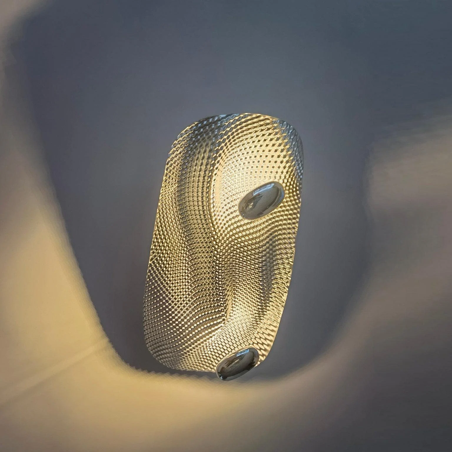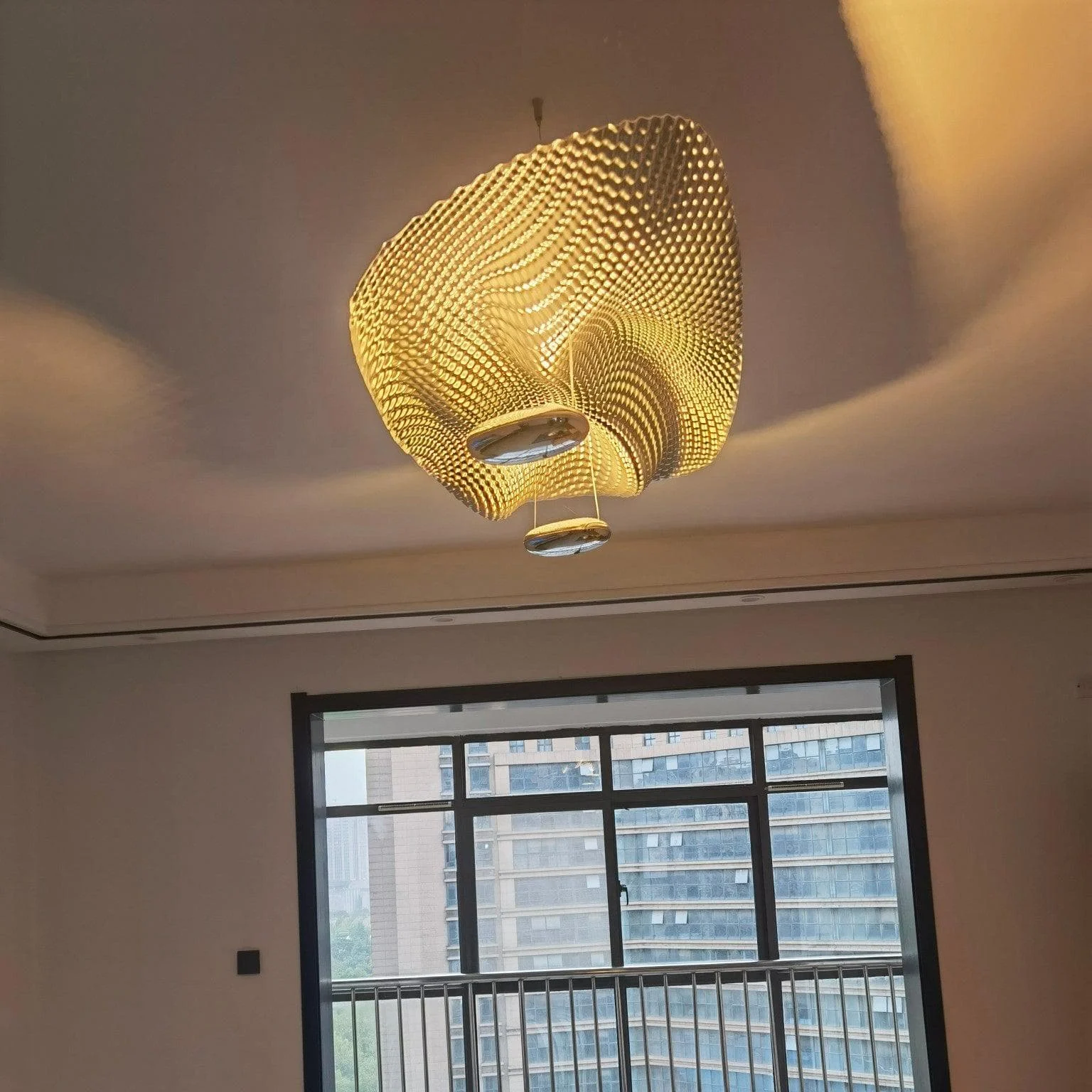 Cosmic angel suspension is a suspension lamp designed by Ross Lovegrove . The suspension version looks as an angel flying, and that plays with lights and shadows. It has a chromed steel structure and the body lamp-diffuser is in transparent methacrylate with texture.