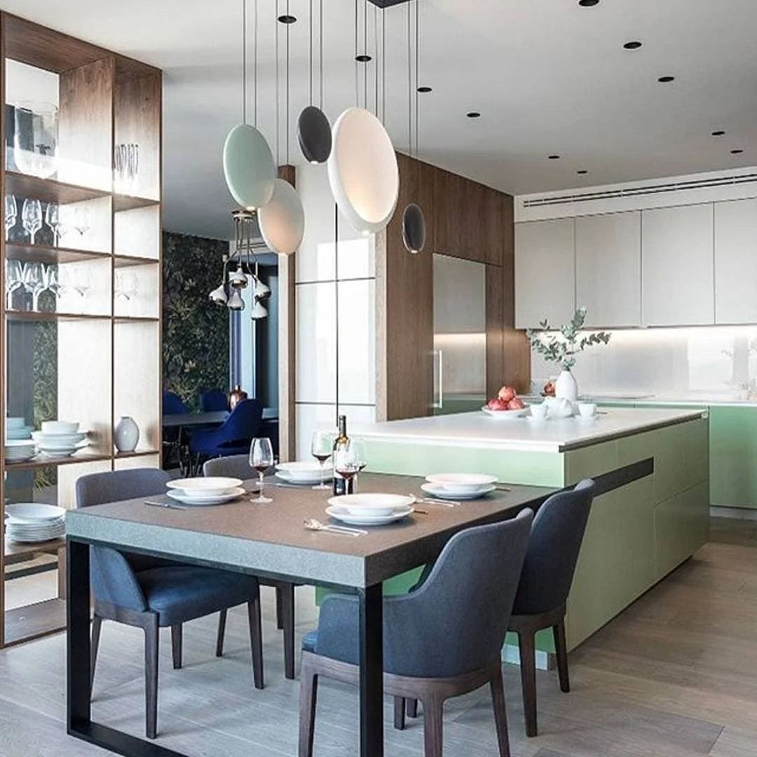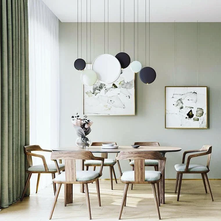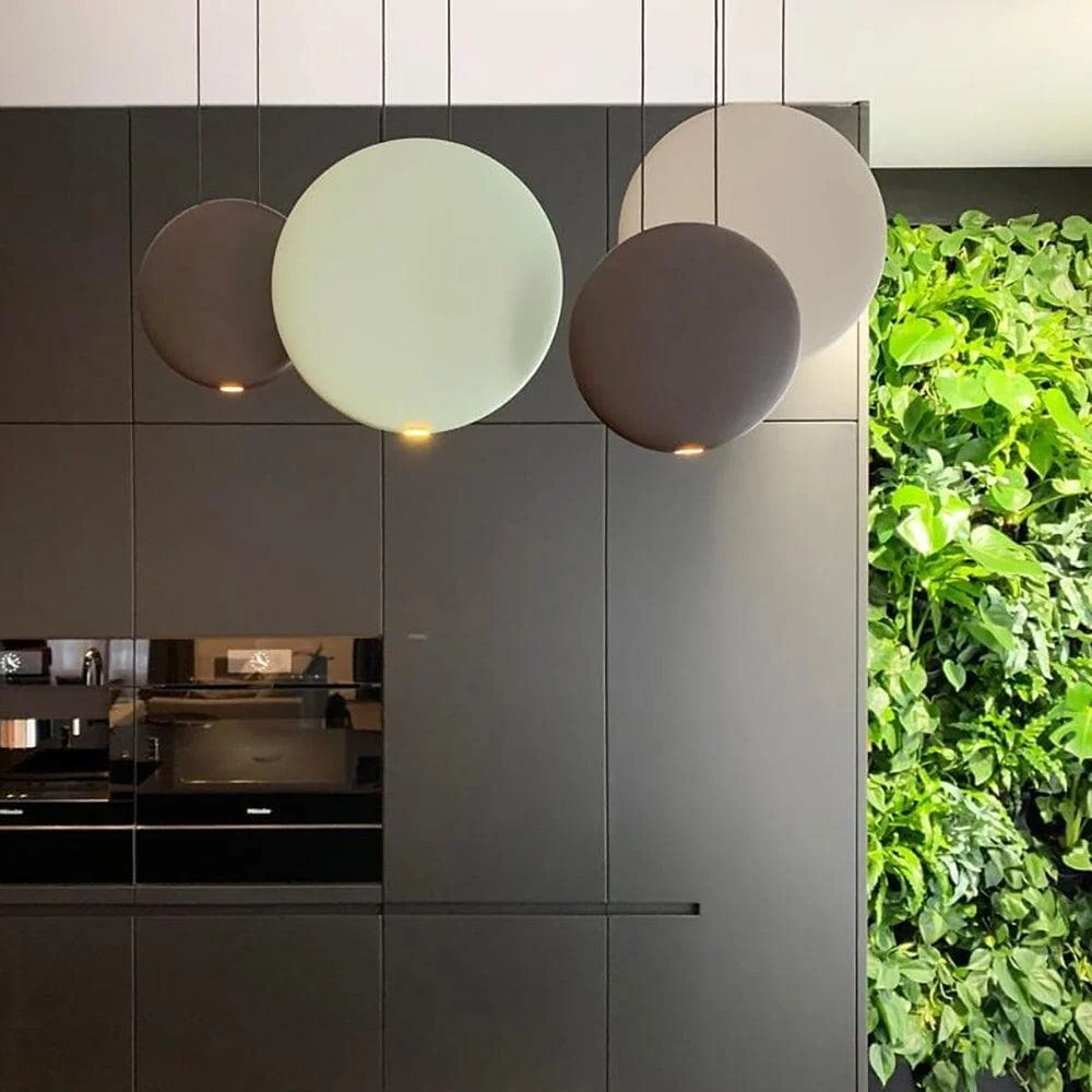 The Cosmos collection consists of pendant light clusters, flattened forms of different sizes that create an optical illusion of hanging spheres that appear to be floating in the air.