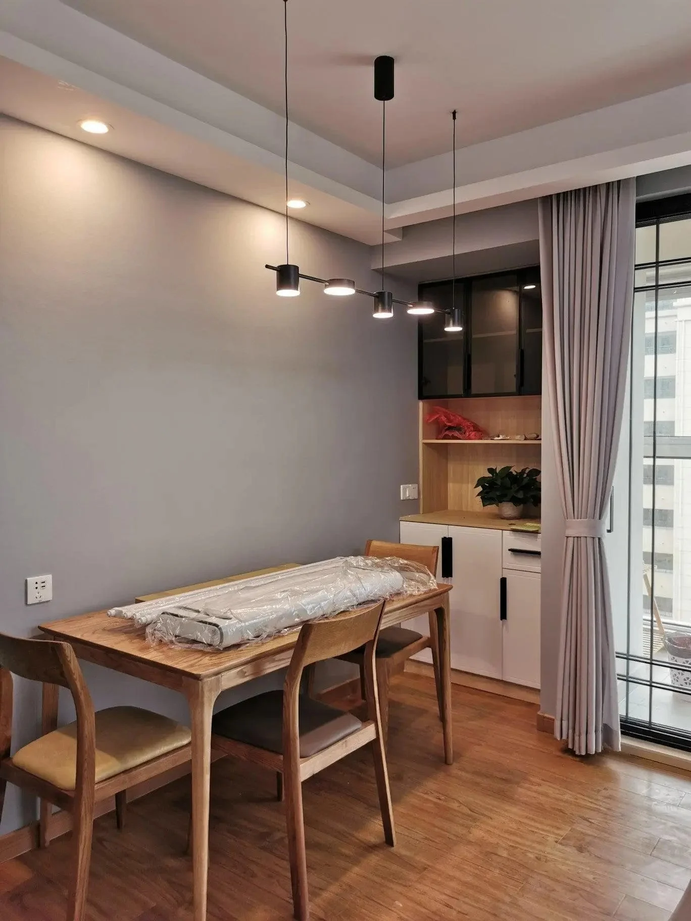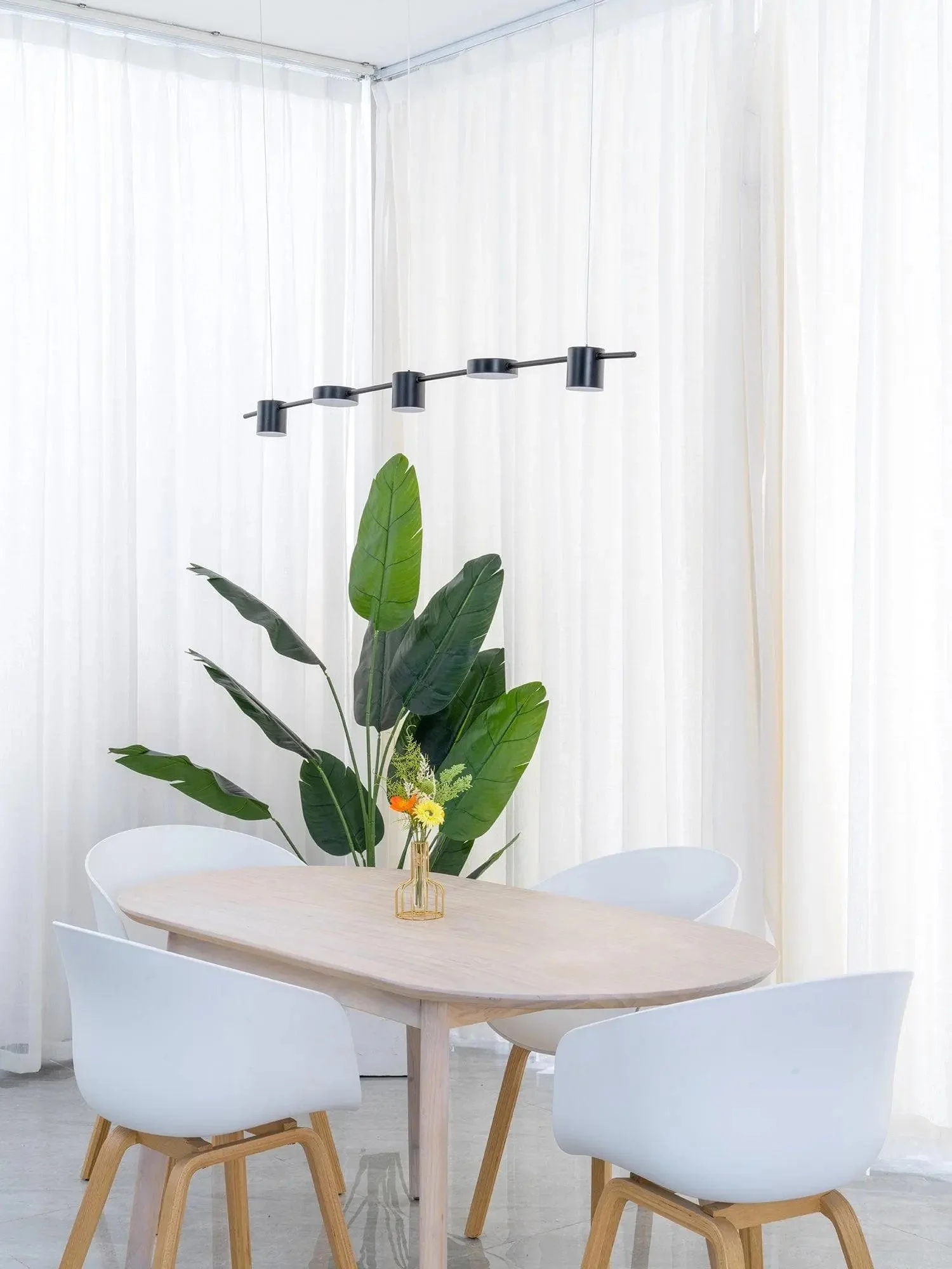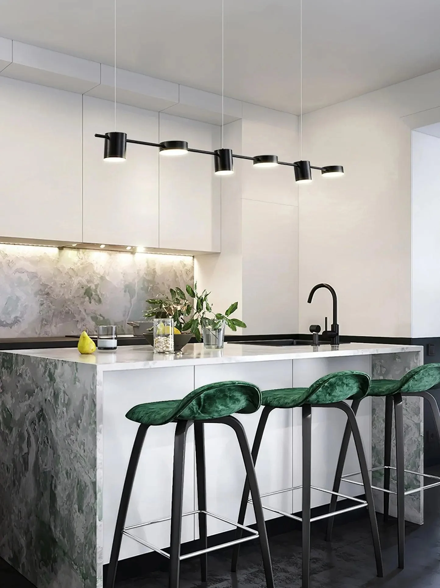 Counterpoint LED linear pendant lights balance simplicity and strength, adding solidity and character to unique spaces. The design features a series of evenly spaced aluminum discs and cylinder hoods, with optical acrylic lenses mounted on slender rods. Use this modern pendant light to bring balanced, bright downlighting to your kitchen island, workspace or long dining table.