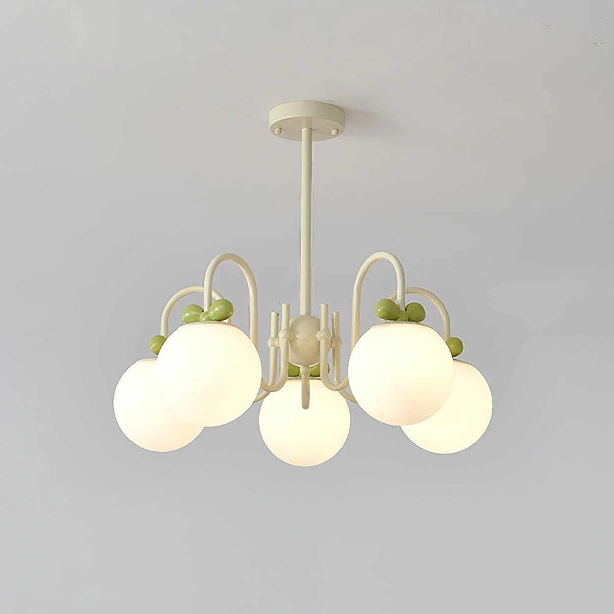 The Cream Cherry Chandelier where playful design meets contemporary elegance. This chandelier, with its cream-colored frame and charming green accents, evokes the whimsy of a cherry tree in full bloom. Each frosted glass globe delicately diffuses light, creating a soft and inviting ambiance reminiscent of a serene orchard at dawn. The whimsical curves and organic motifs bring a breath of freshness to any interior, blending seamlessly with both modern and traditional decor.