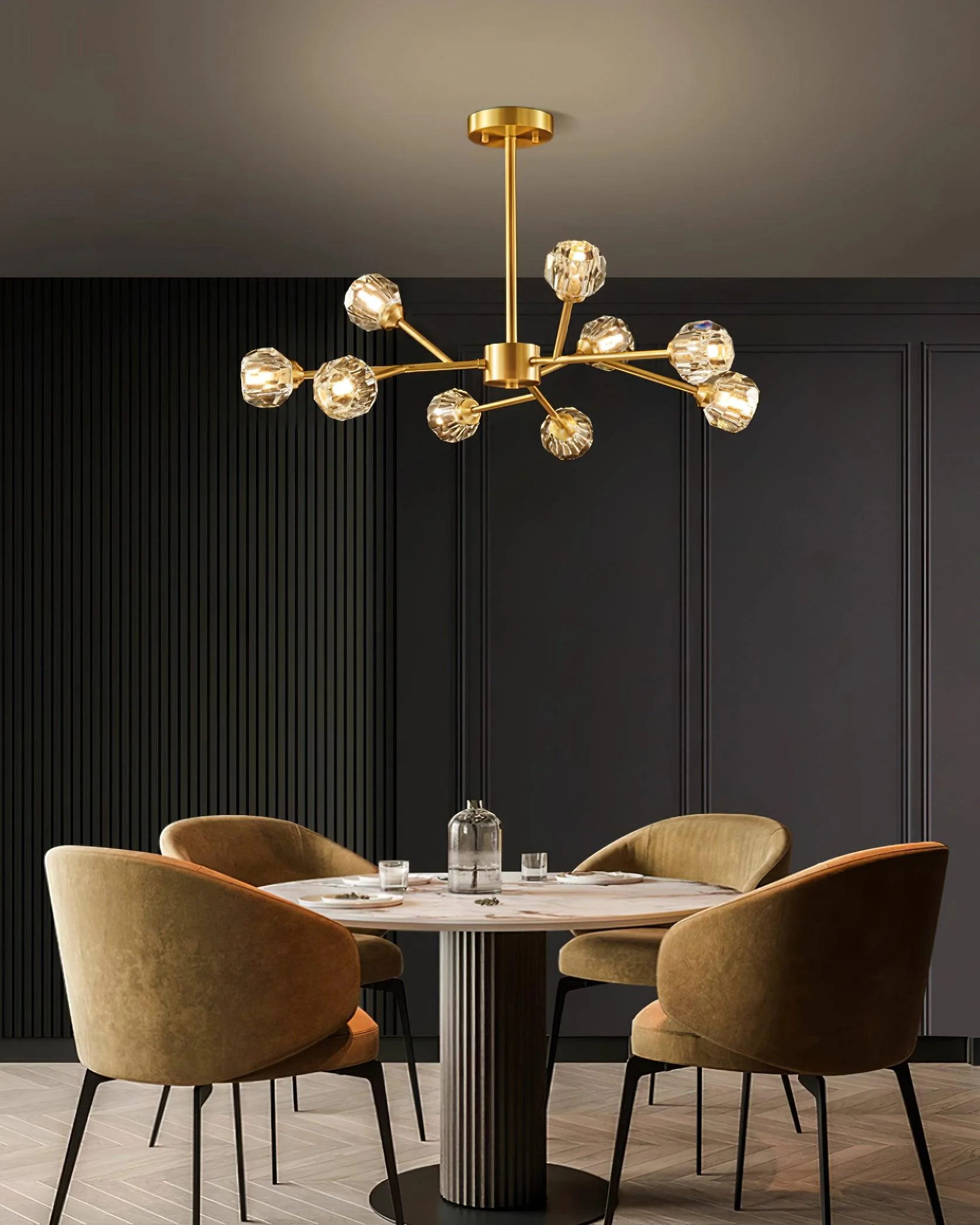 The Crystal Ball Chandelier a masterful blend of solid brass and crystal glass, showcasing a dedication to opulent materials and impeccable craftsmanship. This sculptural fixture pays homage to the minimalist aesthetic of 1960s design, with each meticulously faceted sphere painstakingly hand-ground and polished to capture and refract light. Elevate your interior space with the modern elegance of this chandelier.