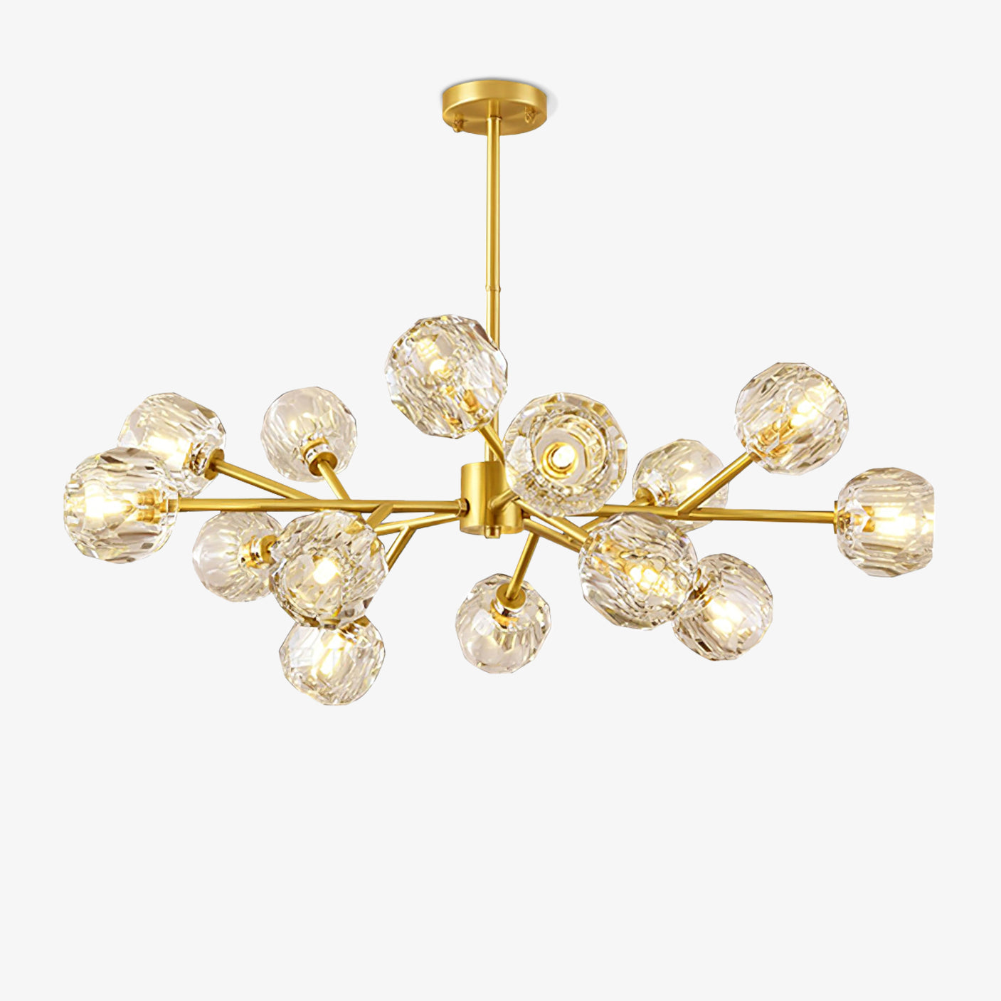 Crafted of solid brass and crystal glass, the sculptural fixture is a testament to the passion for luxe materials and superior craftsmanship. Evoking the minimalist spirit of 1960s design, each finely faceted sphere is ground and polished by hand to reflect and refract the light. Illuminate your interior with this modern chandelier.