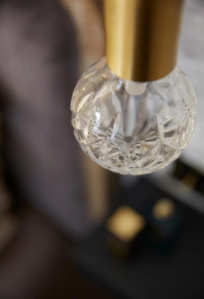 With the Crystal Bulb LED Multi-Light Pendant, Lee Broom takes inspiration from the exquisite and meticulous process of crystal cutting, commonly seen in traditional whiskey glasses and decanters. A grouping of spherical crystal shades suspends in an elegant composition, highlighted by their sophisticated hand-cut design. LED lighting diffused by the shades culminates into a clean ambient glow that accentuates the engraved ornamental logo on each of the Steel lamp holders.