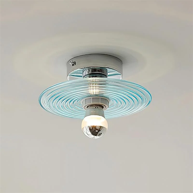 The unique spiral glass shade, available in amber, aqua, or crystal clear, creates a captivating ripple effect, casting a warm, ambient glow across any room. Its sleek chrome base complements the artistic flair, adding a touch of sophistication to both contemporary and classic interiors.