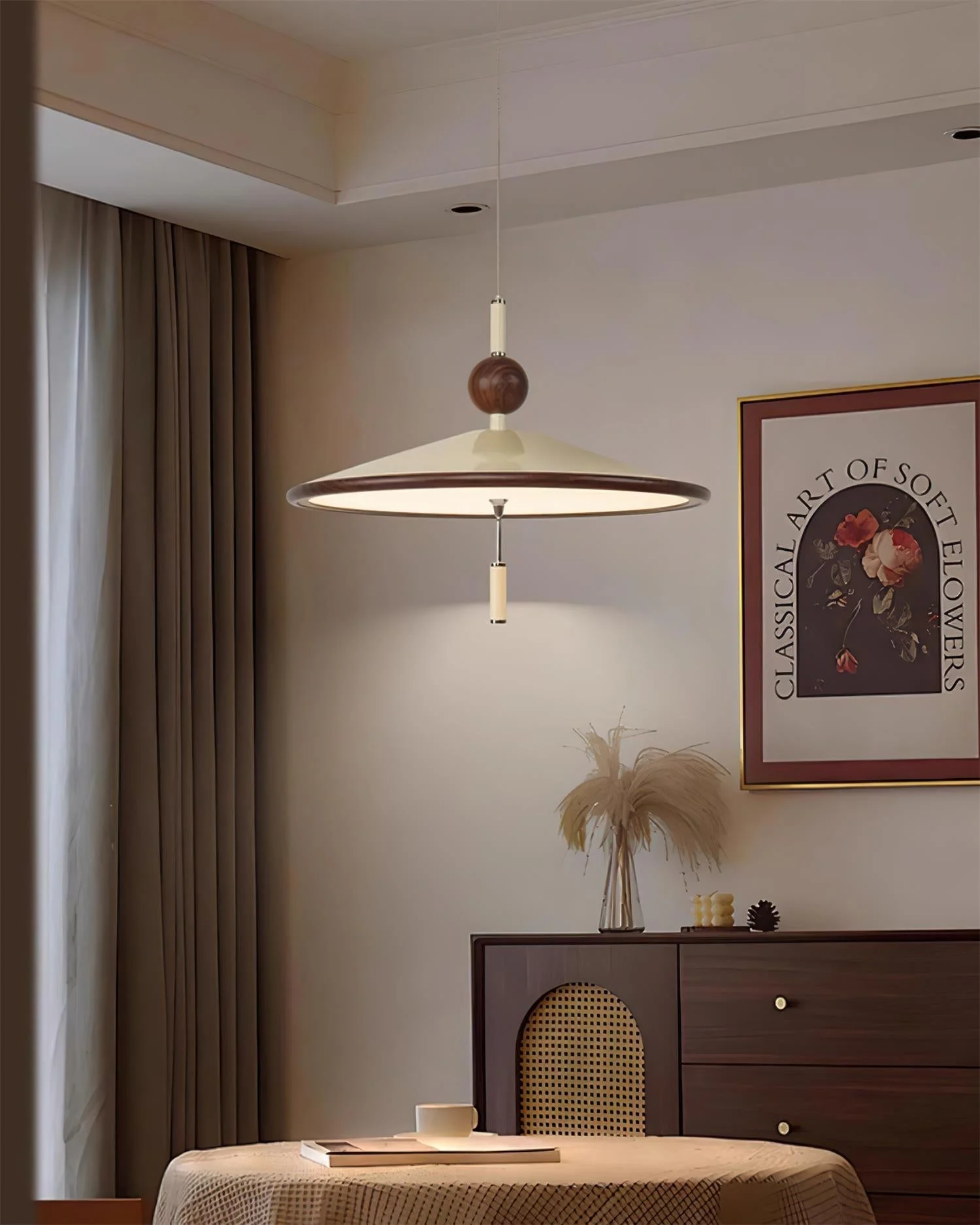 The Devon Pendant Lamp blends modern minimalism with vintage elegance. Its sleek, wide-brimmed shade features a refined Water transfer printing wood-accented trim, adding warmth and sophistication. Emitting a soft, focused light, this pendant lamp creates a cozy and inviting atmosphere. Crafted from high-quality materials, the Devon Pendant Lamp is a timeless statement piece that enhances any interior with its balanced mix of charm and contemporary design.