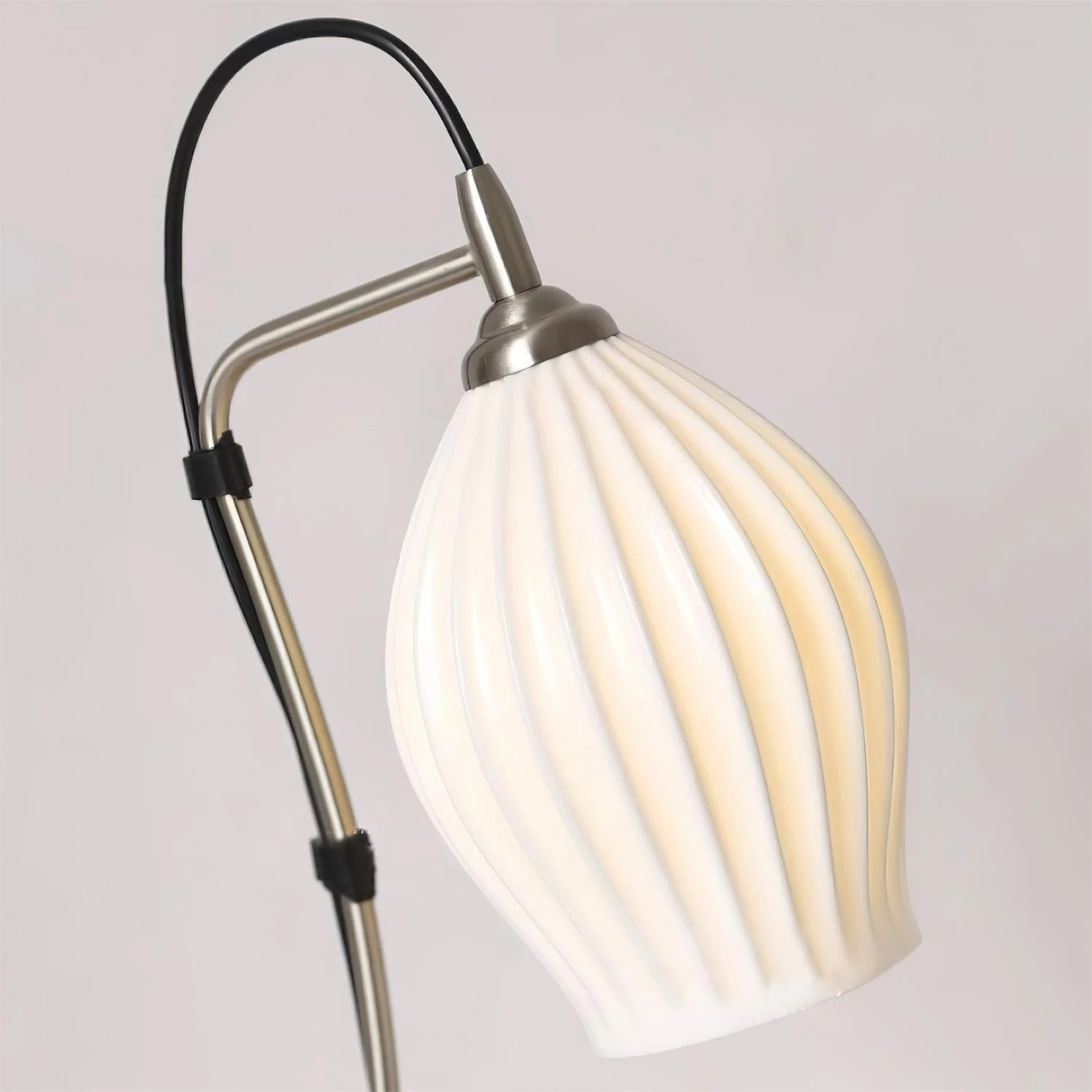 Elevate your interior with this sleek, modern table lamp. Featuring a beautifully textured white ceramic shade and a smooth curved metal arm, it offers a stylish blend of elegance and functionality. Available in brass or brushed nickel finishes, this lamp adds a sophisticated touch to any desk, side table, or reading nook. The soft lighting creates a warm, welcoming atmosphere, perfect for both home and office environments.