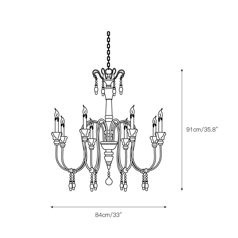 Searching for that perfect centerpiece to add a dramatic lighting element to a favorite room? Look no further! This dazzlingly elegant chandelier features a full dozen candles suspended by gracefully arching wrought iron arms. The central shaft and each candle base are made of solid wood carved by hand in a dazzling array of classical florets. Delicate hand-carved dangles add an extra touch of rich detail to each arm.