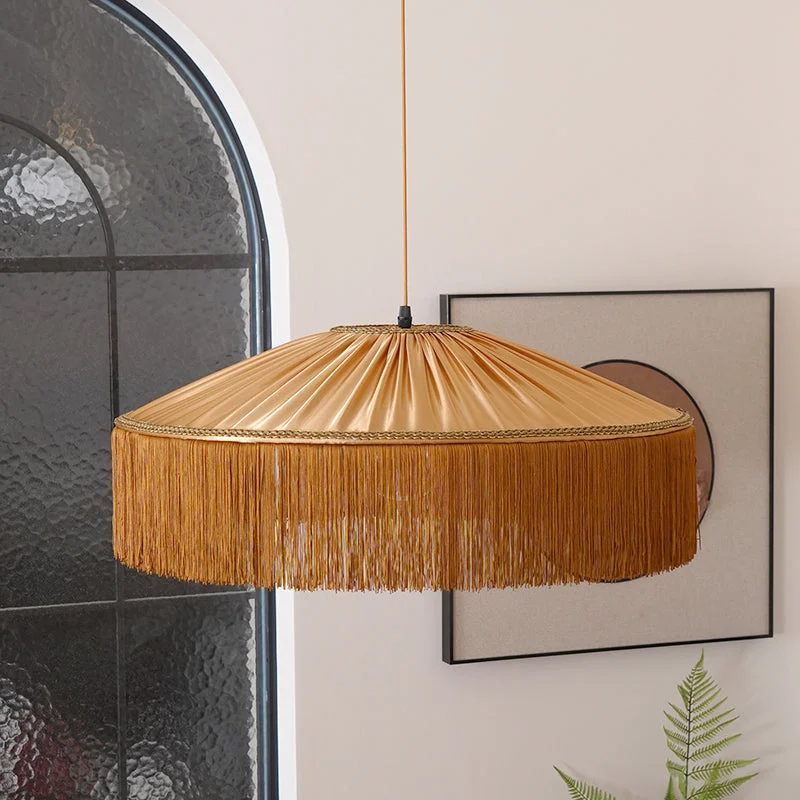 The Diosa Fabric Pendant Lamp a testament to the beauty of fabric artistry in lighting design. This pendant lamp is meticulously handcrafted, featuring a pleated fabric canopy that gracefully diffuses light, creating an inviting glow that enhances any interior space. The fringe detailing, soft to the touch, adds a layer of sophistication and vintage charm.