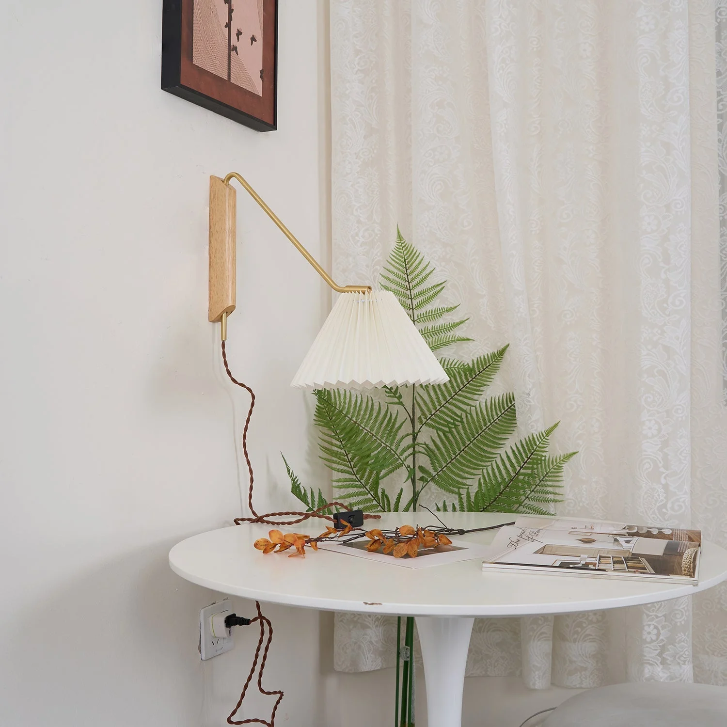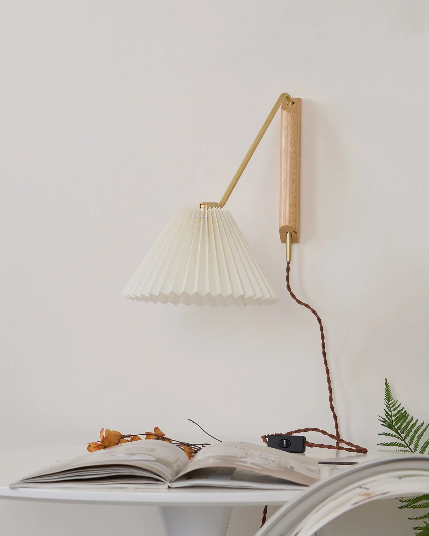 The Dorset Wall Lamp by Docos, a perfect fusion of understated elegance and functional design. Its delicately pleated shade casts a warm, inviting glow, while the brass-finished arm and wooden base offer a sleek, modern touch. The adjustable arm allows you to customize the lighting angle, making it as practical as it is stylish.